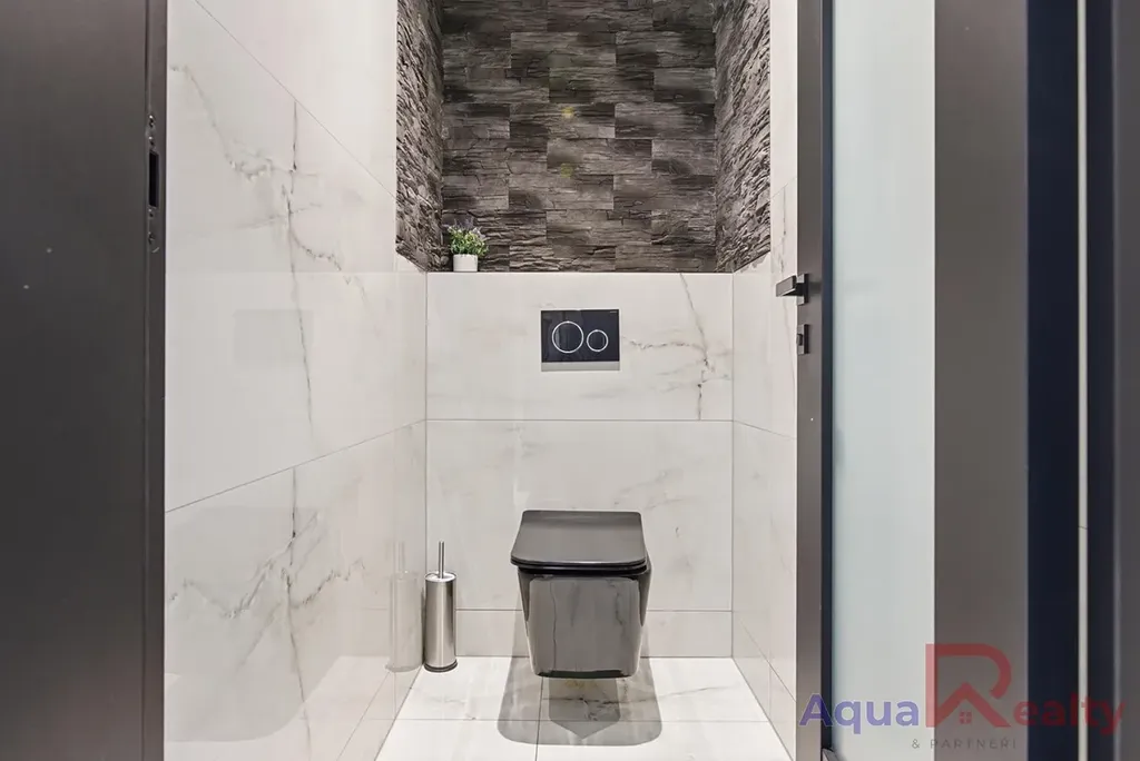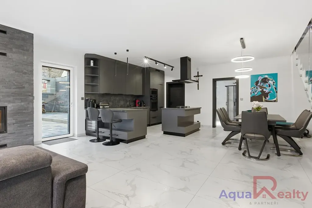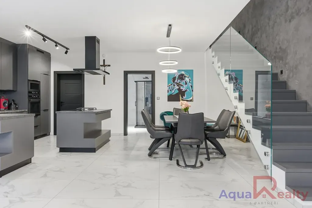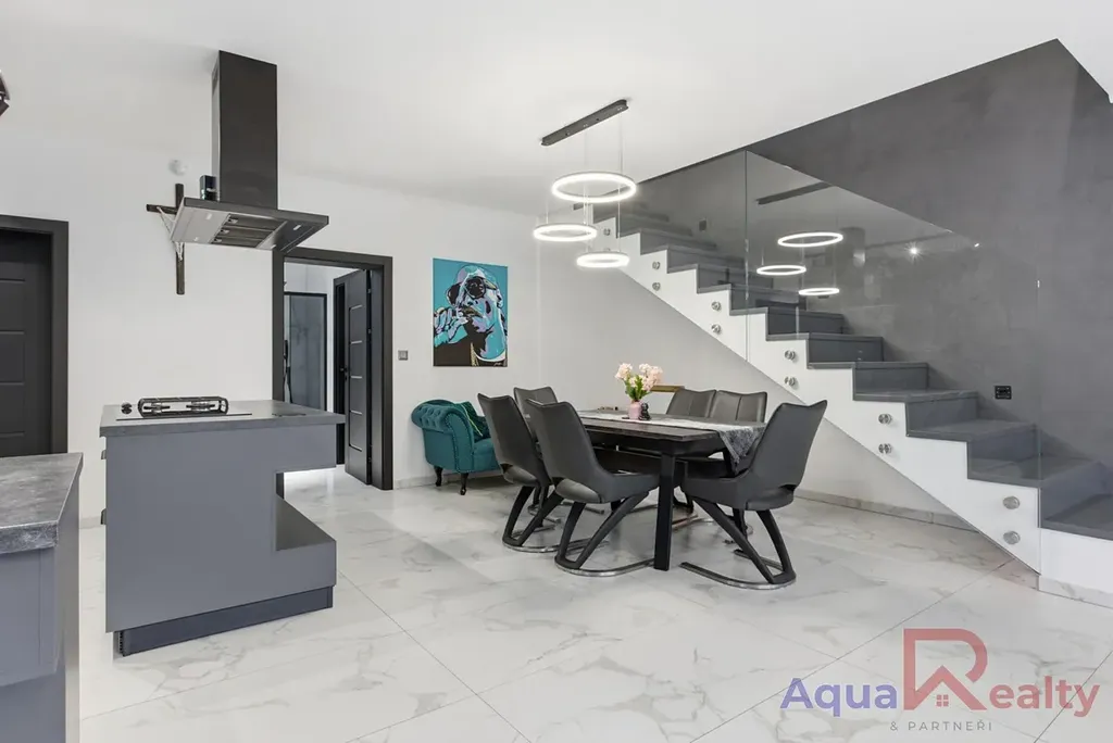 Dispozice 5+kk klade důraz na otevřený prostor, přirozené světlo a plynulé propojení interiéru se zahradou. Dominantou celého domu je velkorysý obývací pokoj s kuchyňským koutem místo, kde začínají rána s výhledem do zeleně a kde večery patří rodině, přátelům a teplu designové krbové vložky.