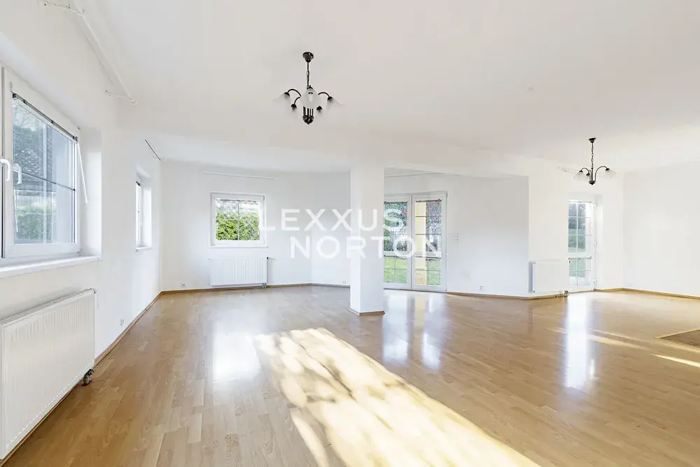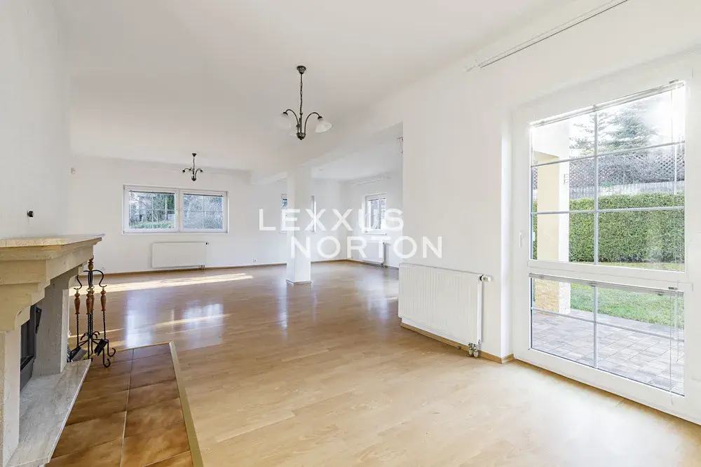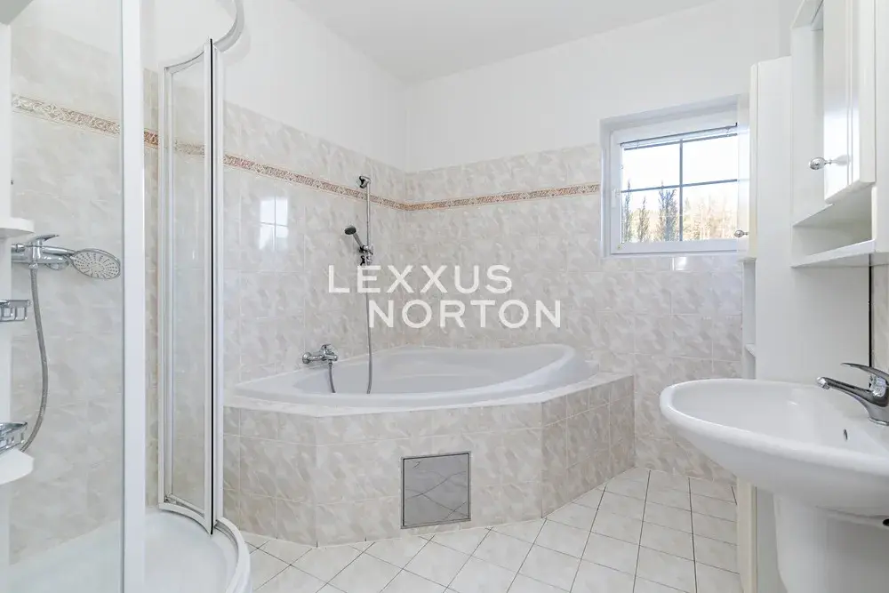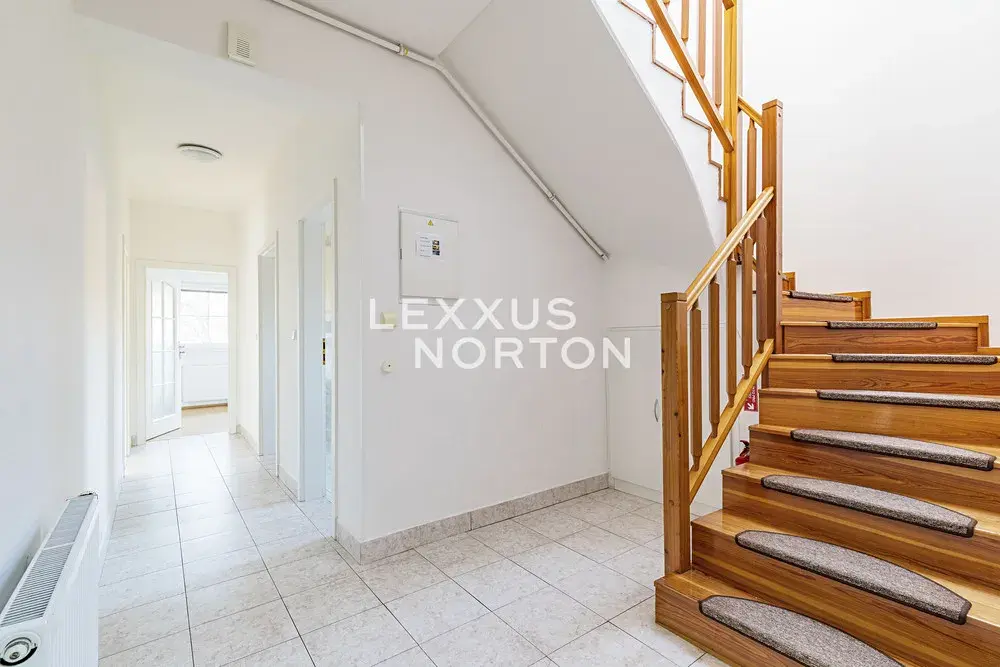 Tento světlý nezařízený rodinný dům k pronájmu nabízí v přízemí k užívání vstupní halu, kuchyň, jídelnu, prostorný obývací pokoj se vstupem na terasu a udržovanou zahradu, pracovnu, pokoj pro hosty, koupelnu a samostatnou toaletu. V patře se nachází 5 ložnic, z čehož 3 ložnice se vstupem na balkon, koupelna, komora a samostatná toaleta. Součástí domu je garáž pro dva automobily, další parkování na pozemku a privátní příjezdová cesta zajišťující maximální komfort a soukromí.