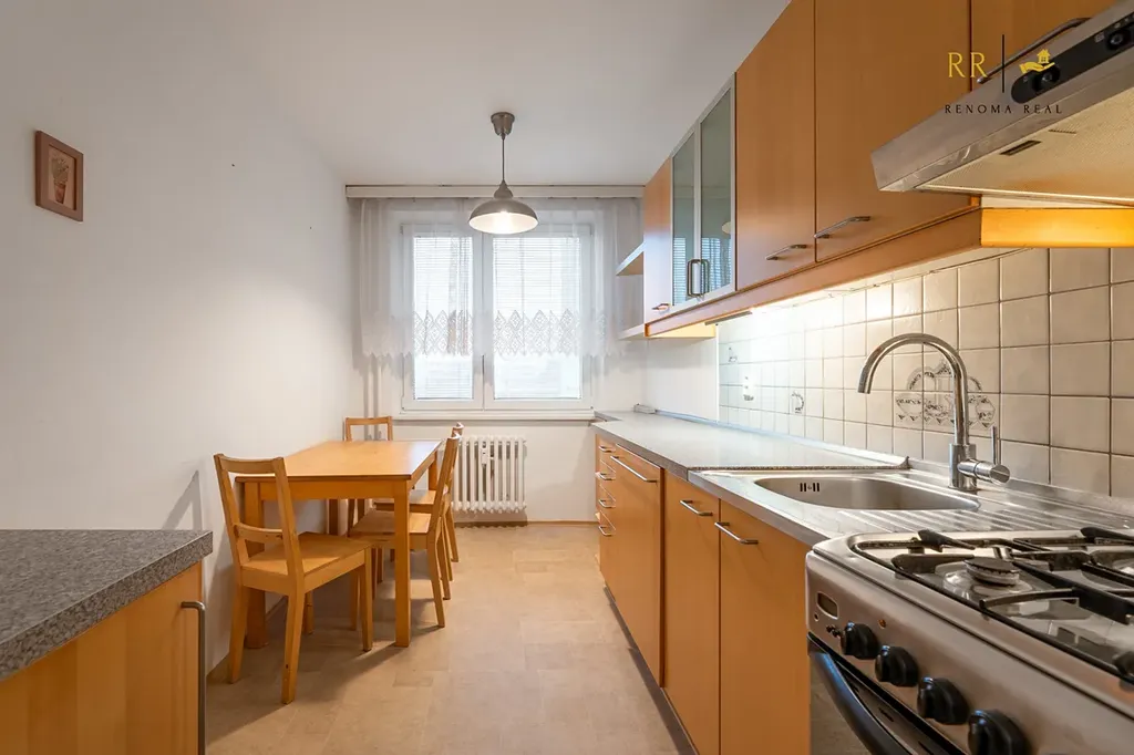 Dispozice bytu tvoří 3 neprůchozí pokoje (16, 12 a 8 m²), samostatná kuchyň, koupelna, samostatná toaleta, prostorná předsíň a praktická komora. Kromě nábytku jsou k dospozici také elektrospotřebiče - plynový sporák s troubou, myčka nádobí a pračka (po domluvě může být doplněna menší lednice).