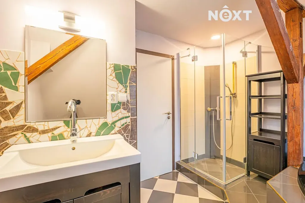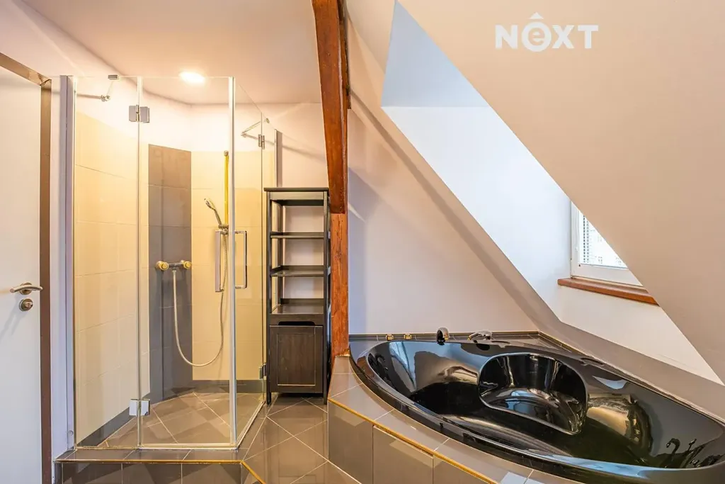 Byt s podlahovou plochou 83 m2 se nachází v 3.NP (nejvyšším patře) cihlového domu v klidné lokalitě blízko centra města. Chodba, v níž se nachází vestavěná skříň se zrcadlem, je průchozí do všech místností. V koupelně najdete sprchový kout i vanu, umyvadlovou skříňku se zrcadlem a prostor na pračku. WC je zvlášť. Část obývacího pokoje tvoří na míru vyrobená kuchyňská linka s vestavěnými spotřebiči jako je varná deska, elektrická trouba a myčka. Z něj vystoupáte do patýrka nebo vyjdete na balkon.