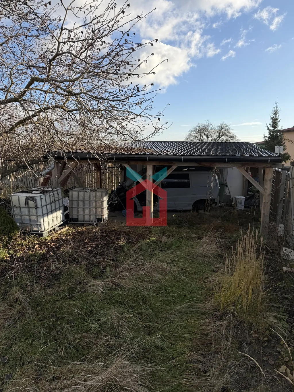 • Přístřešek navazující na dům – dřevěná trámková konstrukce, plechová střecha, vhodný jako zahradní posezení