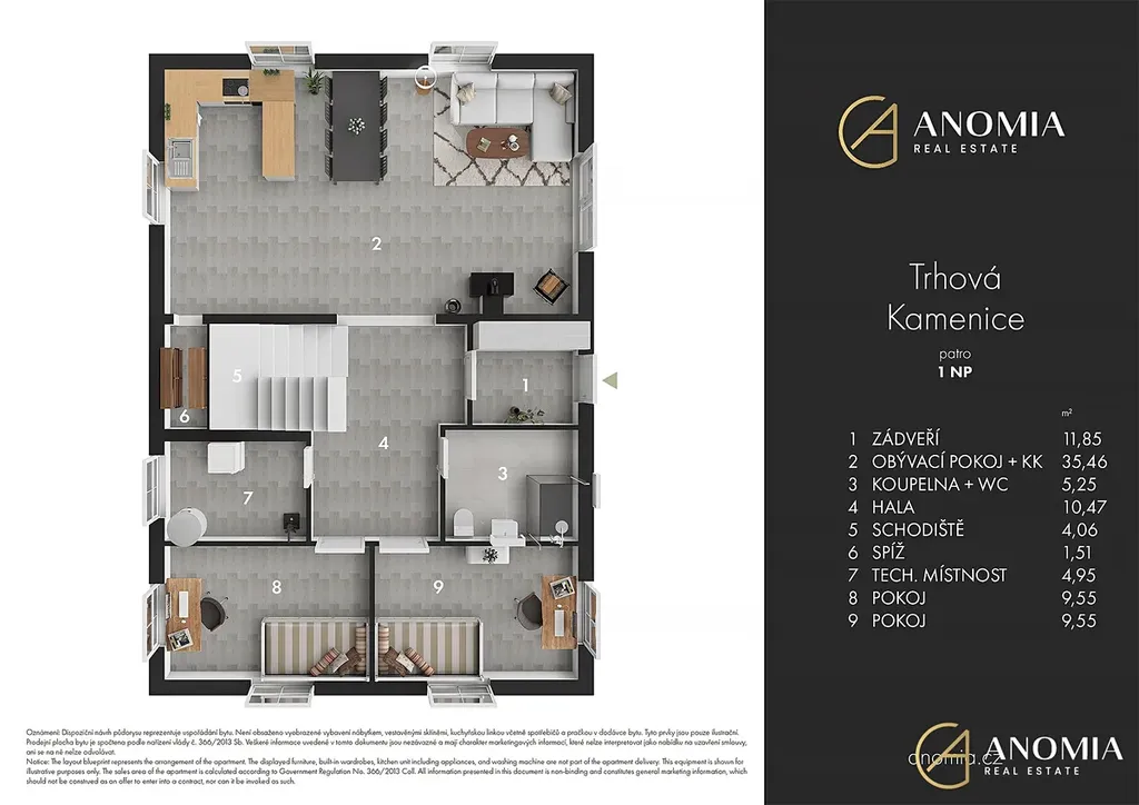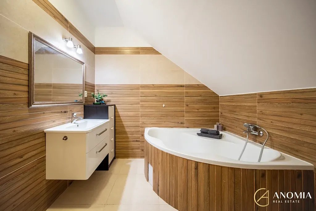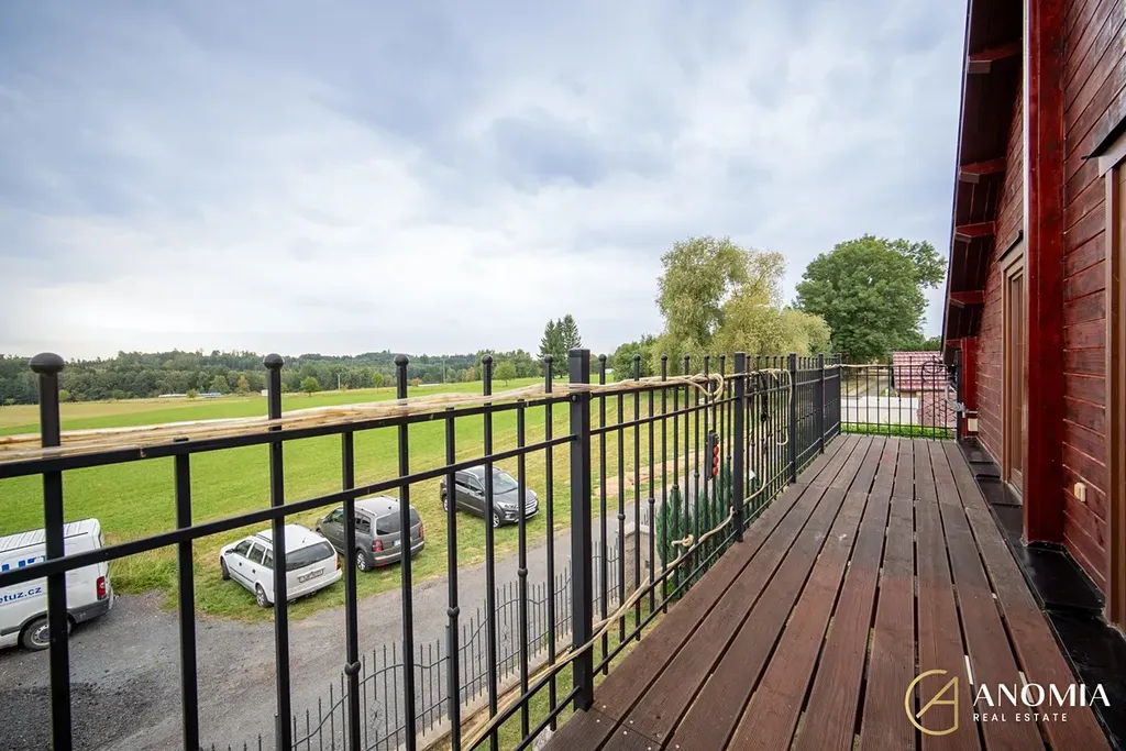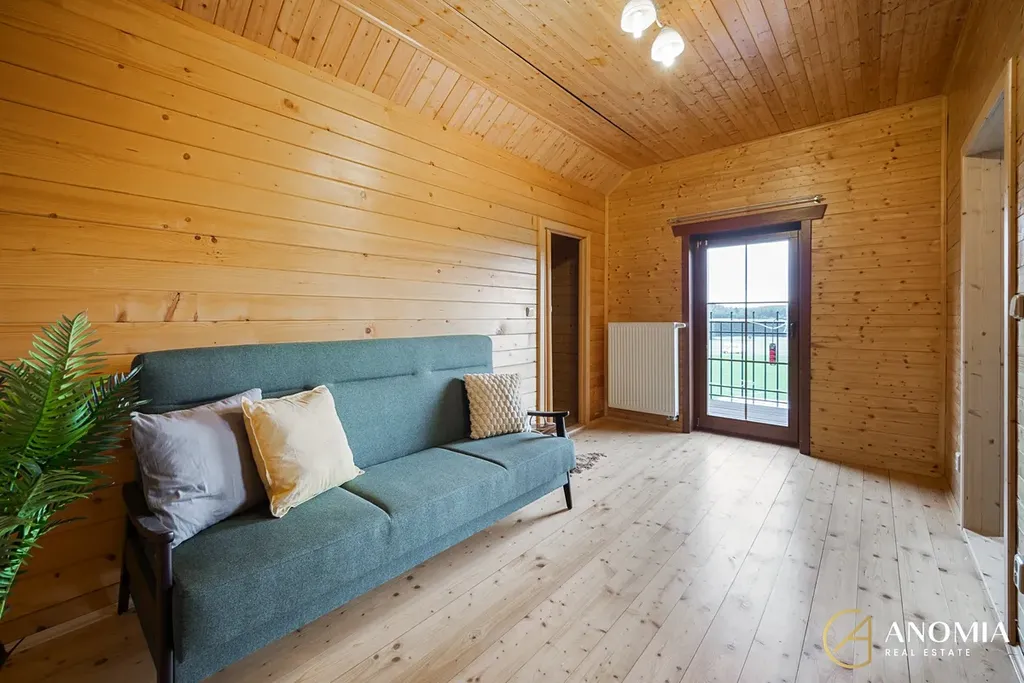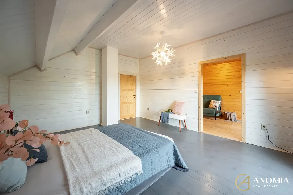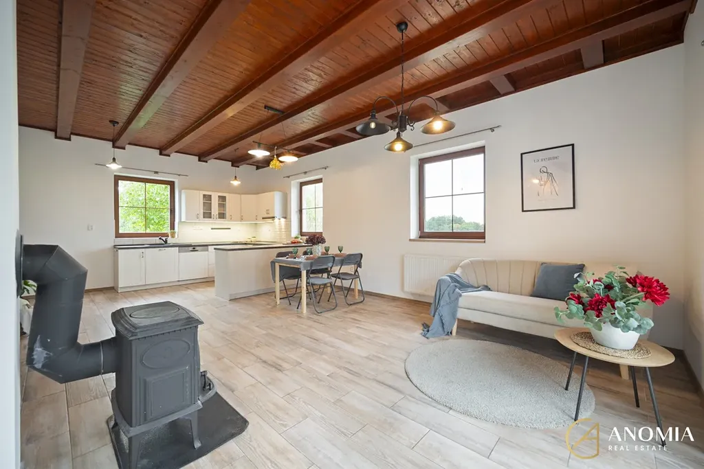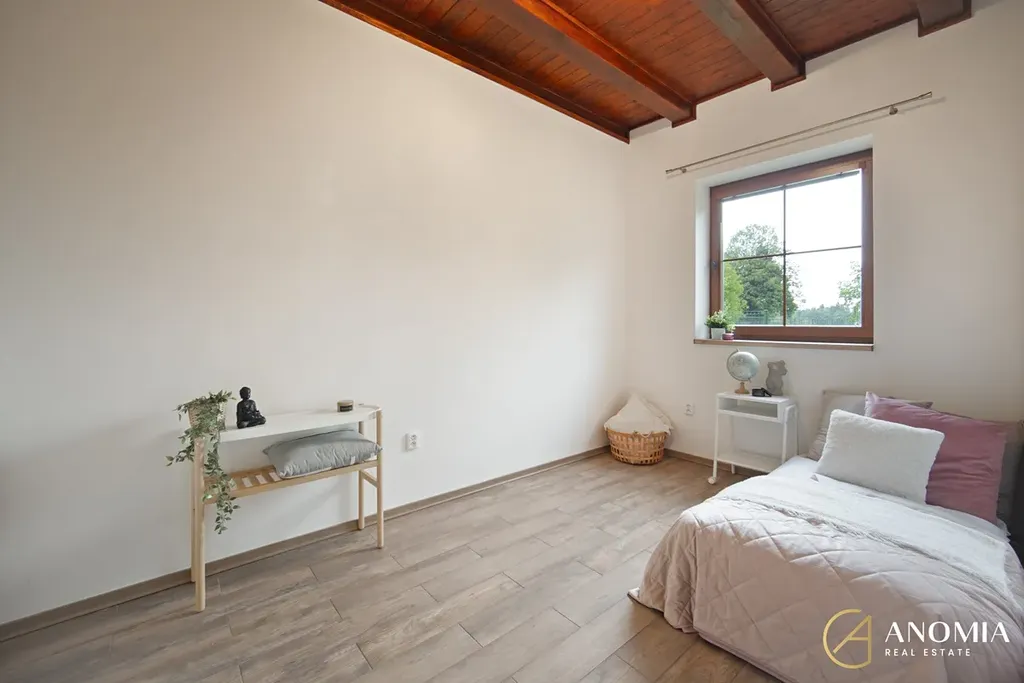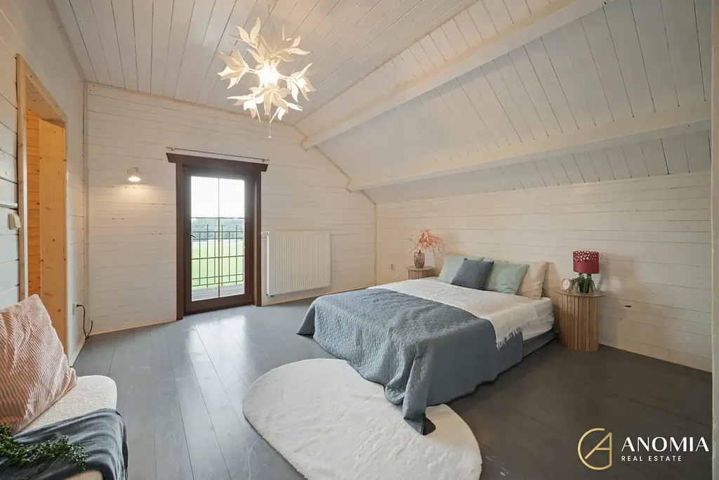 Dominantou přízemí je prostorný obývací pokoj, z kterého je přímý výstup na terasu. Kuchyně je ve venkovském, moderním stylu a v kombinaci s dřevěnými stropy a krbovými kamny působí velice útulným dojmem. Spodní patro doplňují také dva pokoje. Do druhého patra vede elegantní dřevěné schodiště, odkud se dostanete do čtyř samostatných pokojů s krásnými výhledy do okolní přírody. Dům dále disponuje dvěmi koupelnami – jednou se sprchovým koutem a druhou s vanou, technickou místností a čtyřmi prostornými šatnami, které poskytují dostatek úložného prostoru.