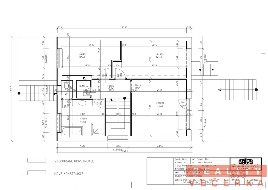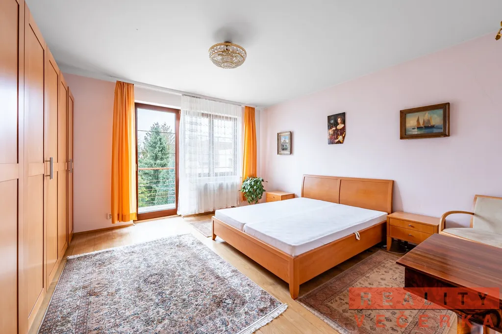 Toto patro tvoří tzv. klidovou zónu – jsou zde 3 ložnice (19,4 m2, 14,1 m2 a 13,5 m2), prostorná koupelna s vanou a sprchovým koutem, samostatné WC a komora Z jedné ložnice lze vstoupit na balkon s vyhlídkou do zahrady. Tyto prostory mohou sloužit nejen jako ložnice, ale i jako kanceláře, hostinské pokoje atd.