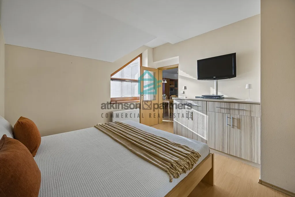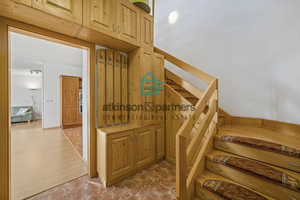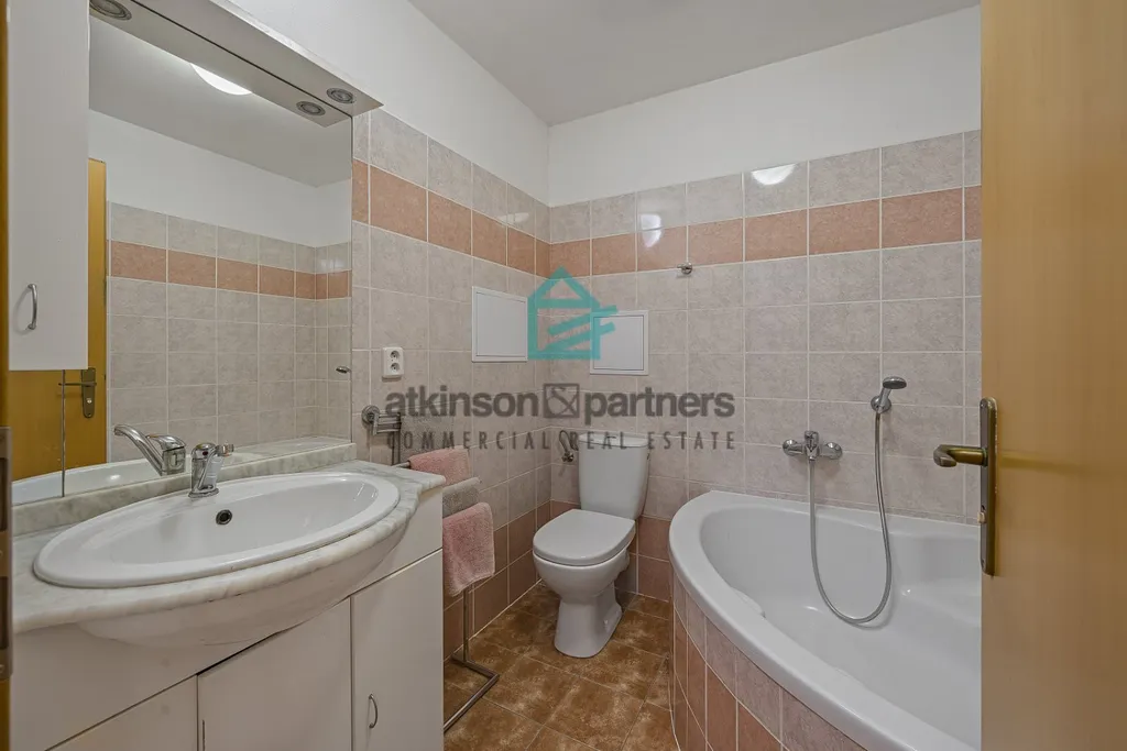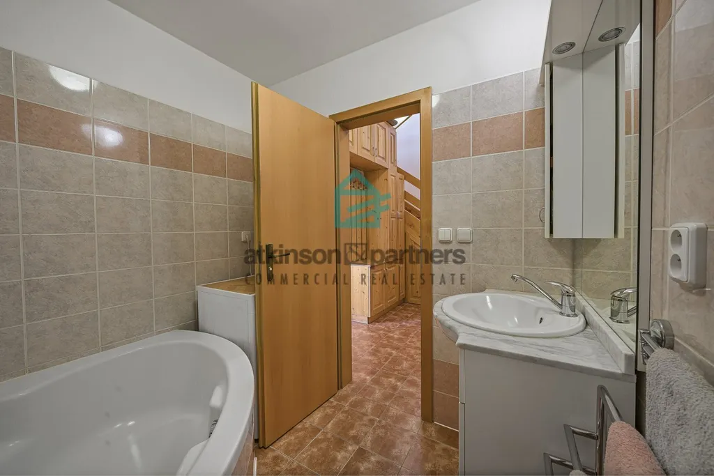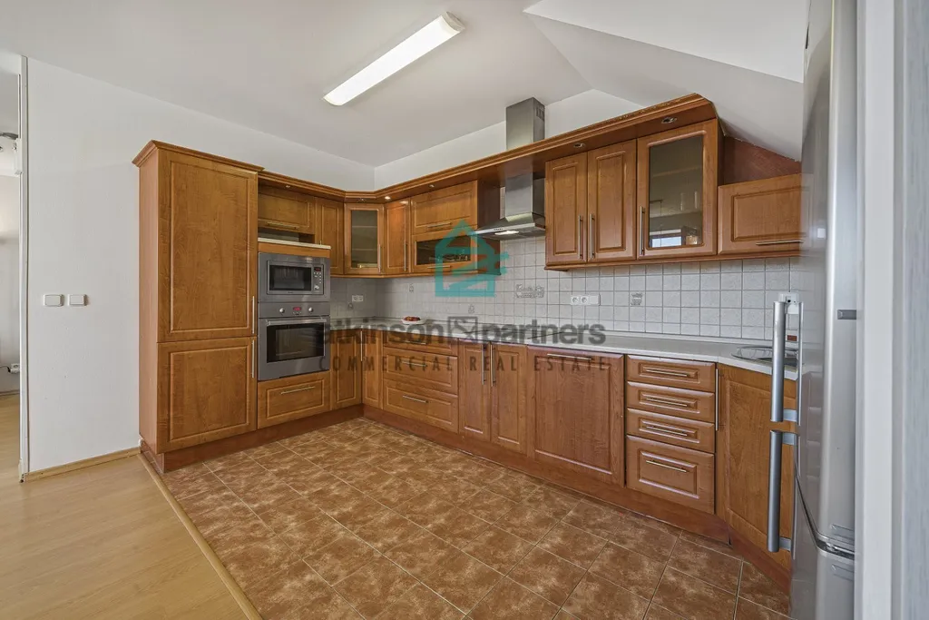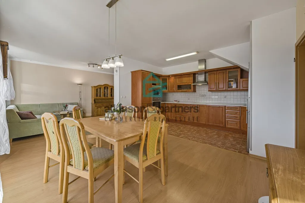 Byt disponuje dvěma koupelnami, jednou s vanou a druhou se sprchovým koutem a toaletou. Dominantou bytu je prostorný obývací pokoj s kuchyní, která je vybavena moderní kuchyňskou linkou se spotřebiči. Mezonetové řešení zajišťuje dostatek soukromí i prostoru pro rodinu, dispozičně stejně jako v rodinném domě.