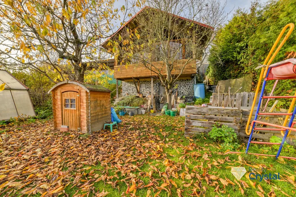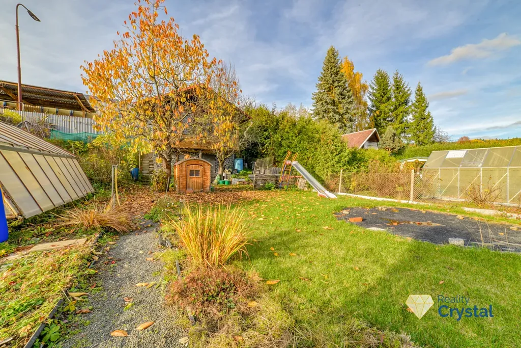 Na zahradě se nachází dětský zahradní domeček a skleněný skleník.