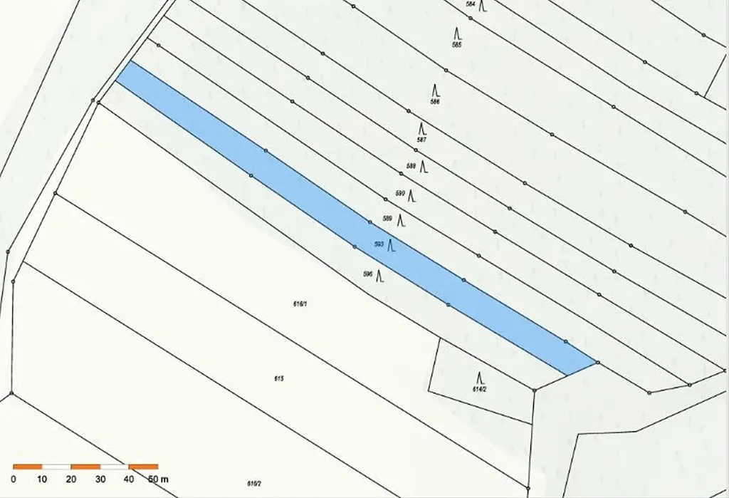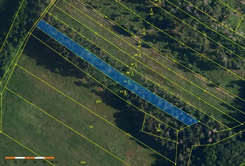 Jedná se o prodej odloučeného lesního pozemku menší výměry, velmi úzkého, protáhlého tvaru, který leží mezi lesními pozemky ve vlastnictví fyzických osob. Po provedené těžbě se na pozemku nachází prořídlý 79-letý porost borovice, zakmenění 5 a je dobře přístupný.