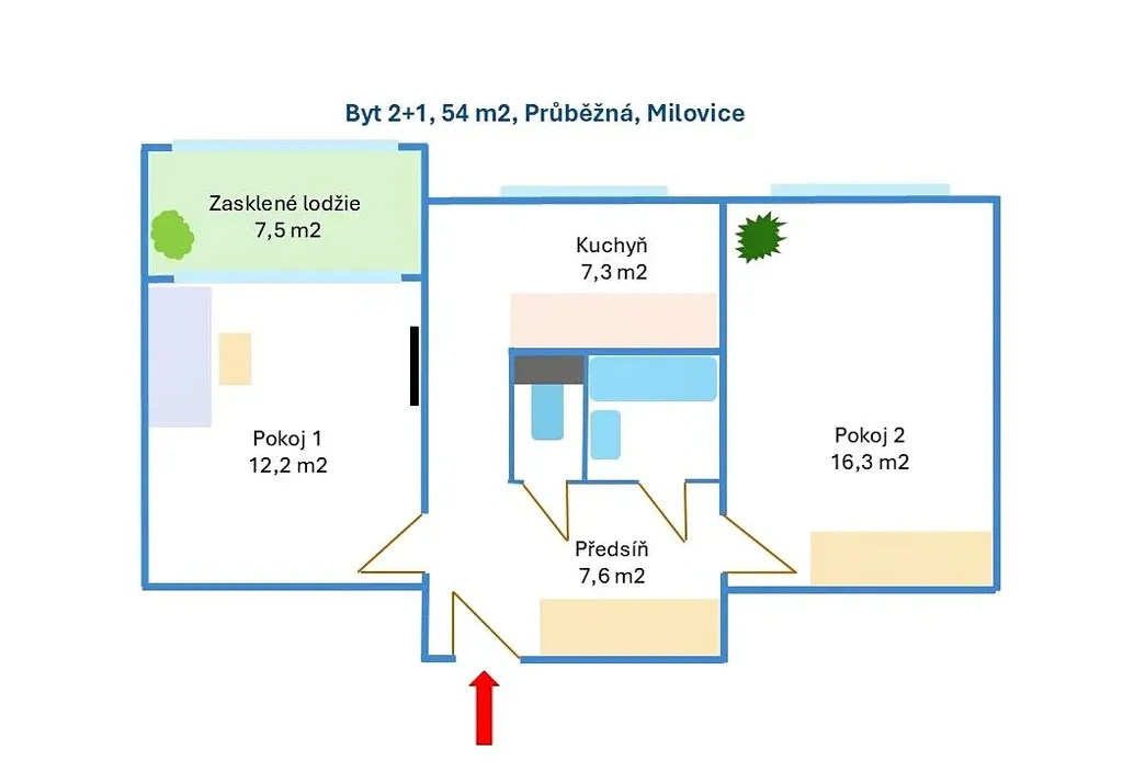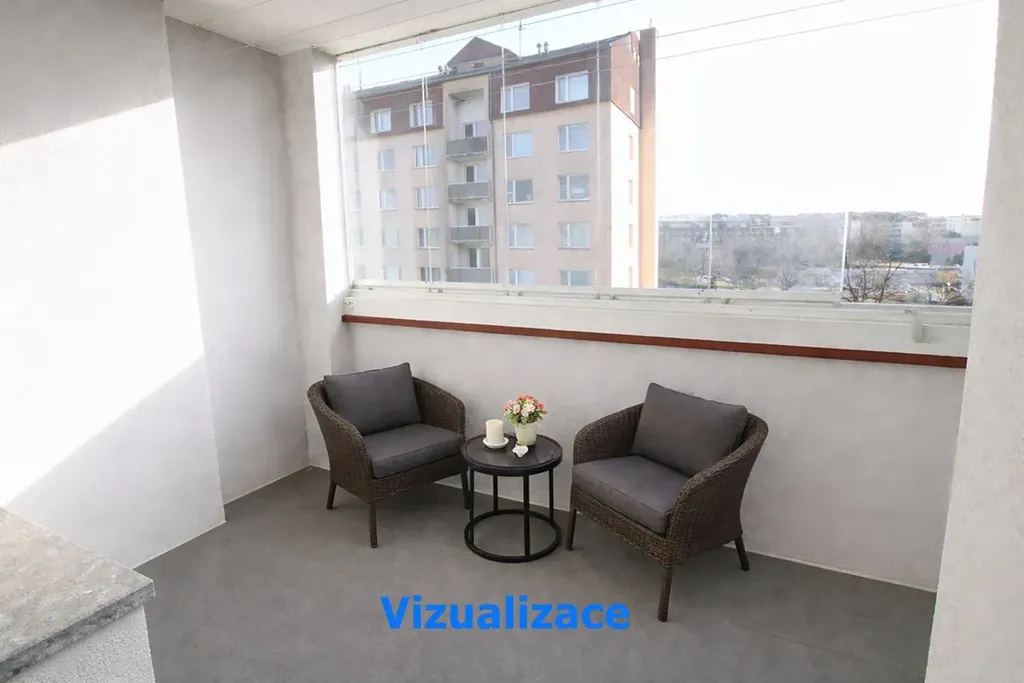 Dispozice bytu zahrnuje dva neprůchozí pokoje o výměrách 16,3 m2 a 12 m2, kuchyň s okny o velikosti 7,3 m2, vstupní halu 7,6 m2, koupelnu s vanou a samostatné WC. Byt má plastová okna se žaluziemi s jihovýchodní orientací, zděné bytové jádro, nové interiérové dveře a plovoucí podlahy v obytných místnostech. Zvětšená lodžie s nadstandardní hloubkou 2,2 m přímo vybízí k vytvoření dalšího životního prostoru a k příjemnému posezení v teplejších měsících.