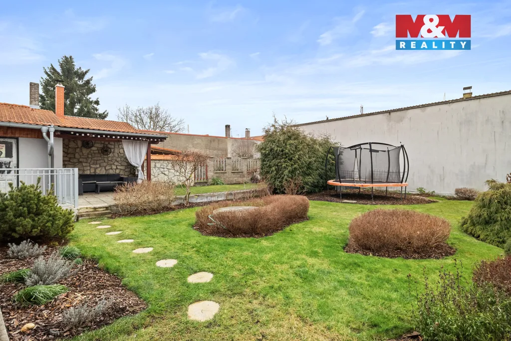 Na zahradě, která je rovinatá a snadno udržovatelná, se nachází dílna a kryté posezení, ideální pro relaxaci i praktické využití. Parkování možné na pozemku.