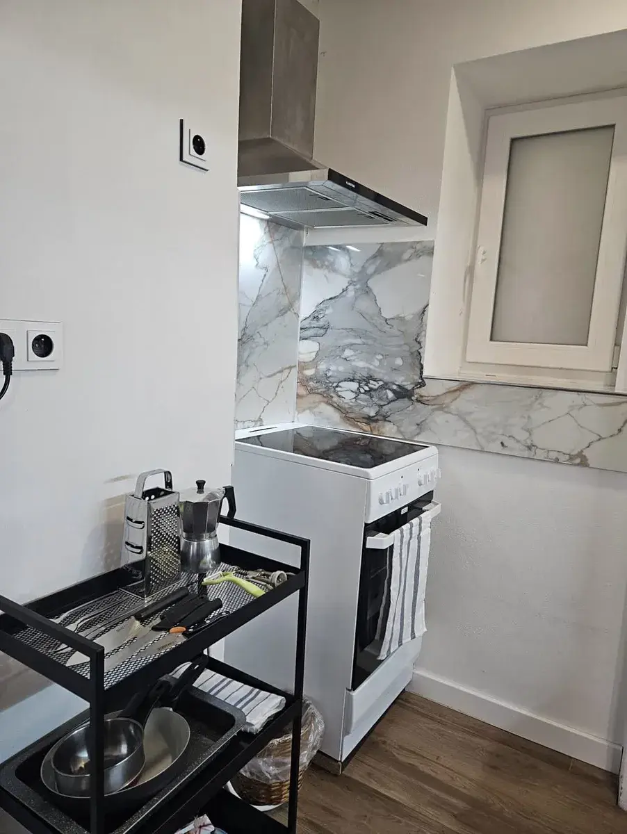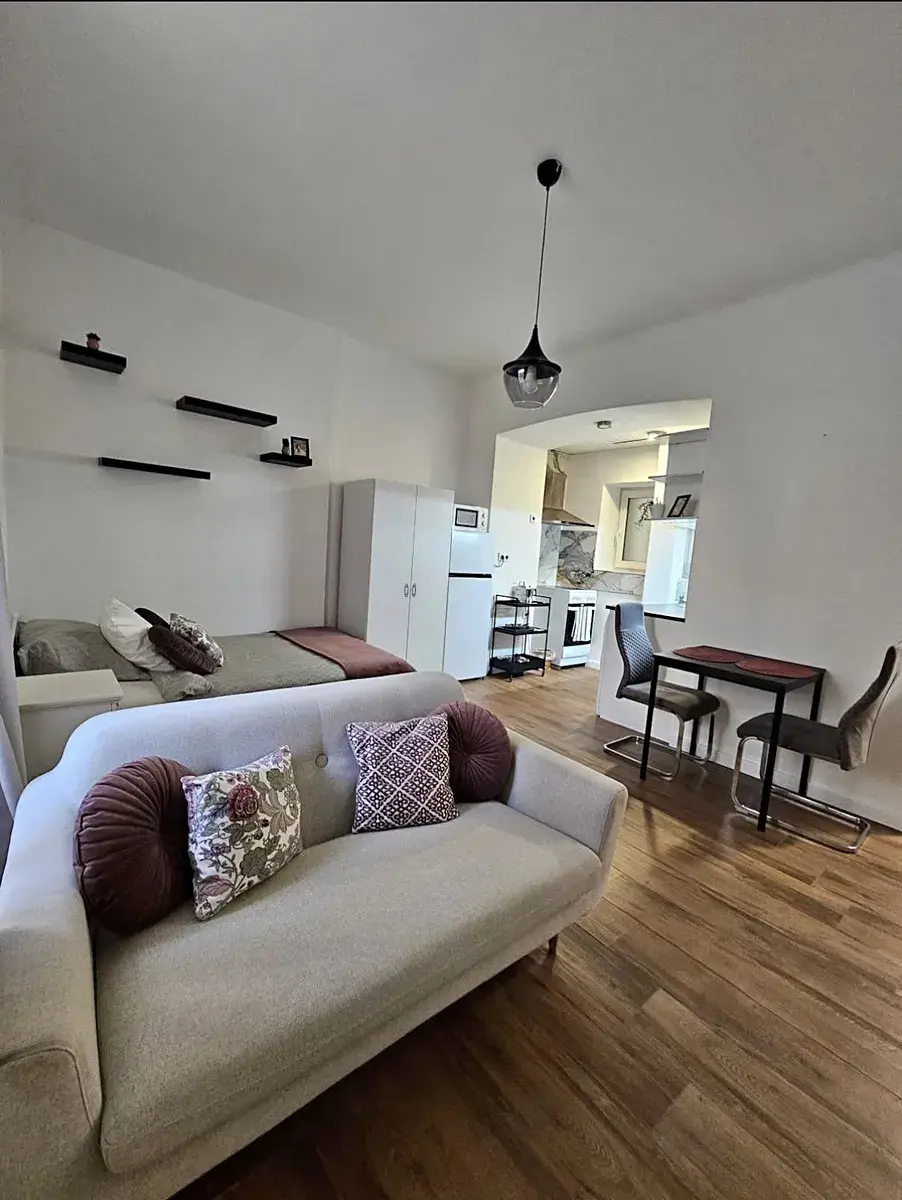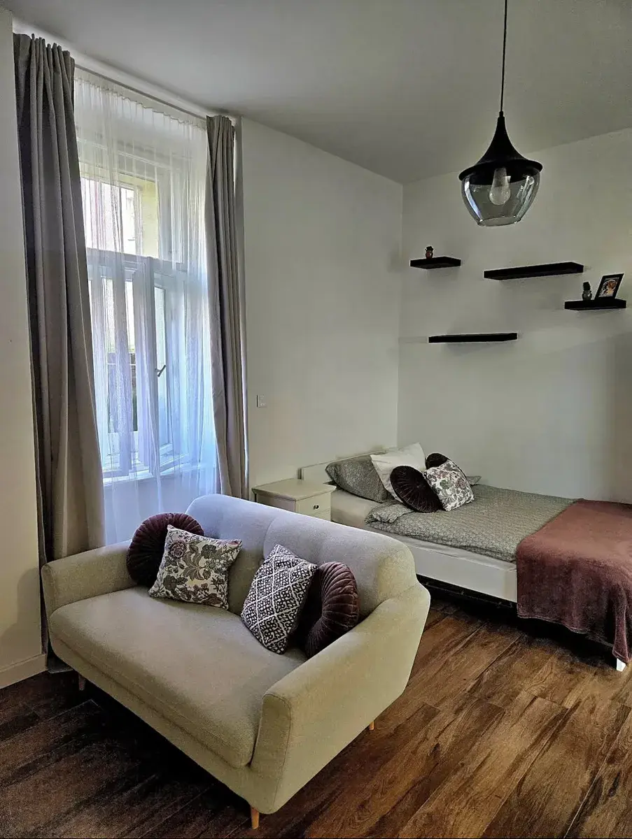 Apartmán je nově zrekonstruovaný, plně zařízený a navržen v moderním, vkusném designu. Dispozice 1+kk zahrnuje prostorný obytný pokoj vhodný pro jednotlivce nebo pár. Součástí vybavení je velká lednice, čtyřplotýnková varná deska, trouba, mikrovlnná trouba, 50" chytrá televize a pračka se sušičkou. Postel má šířku 120 cm.