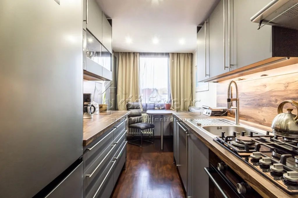 Byt zaujme praktickou dispozicí i vysokým standardem vybavení. Je připojený k zabezpečovacímu systému Jablotron, přístup do bytu vede přes uzamykatelnou chodbu oddělenou od výtahů a schodiště. Kuchyňská linka na míru v hodnotě 260 000 Kč byla instalována před 2 měsíci a je vybavena vestavnými spotřebiči (myčka, plynový sporák, elektrická trouba, digestoř, lednice s mrazákem). V bytě jsou snížené stropy s bodovými světly, v ložnici i pokoji v horním patře lesklé stropní panely. V předsíni i pokojích jsou prostorné vestavěné skříně a další úložný prostor nad schodištěm.