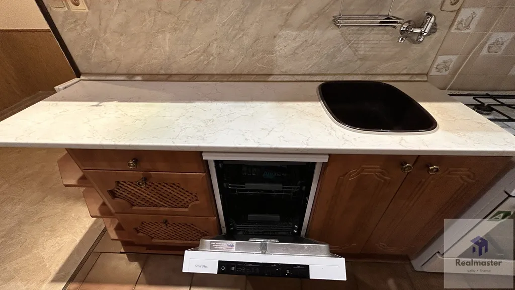 V bytě je kuchyňská linka s plynovým sporákem, kuchyně je do L a je zde místo pro velký jídelní stůl. Koupelna je s hlubokou vanou.