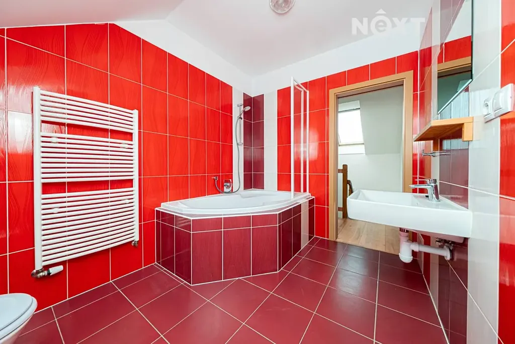 2. NP (Patro): Chodba, dva neprůchozí pokoje (ložnice a dětský pokoj/pracovna) a elegantní koupelna vybavená vanou, sprchovým koutem a druhou toaletou.