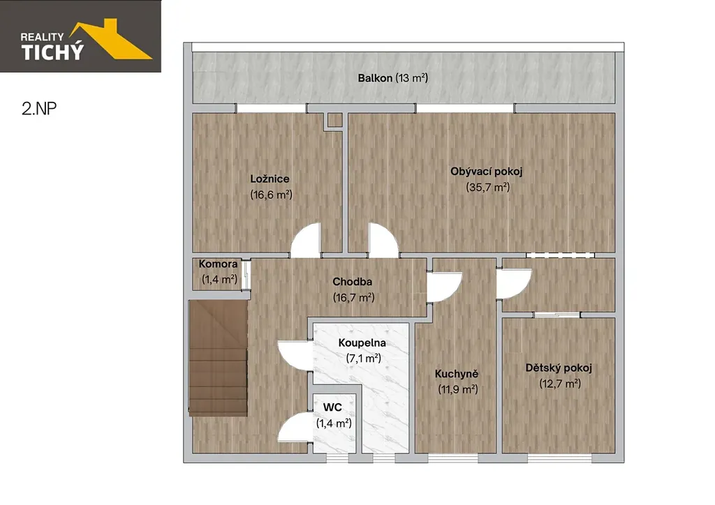  1. patro → byt 3 + 1 (117 m2) po kompletní rekonstrukci – kuchyně s vestavěnými spotřebiči, koupelna s rohovou vanou a sprchou, samostatné WC