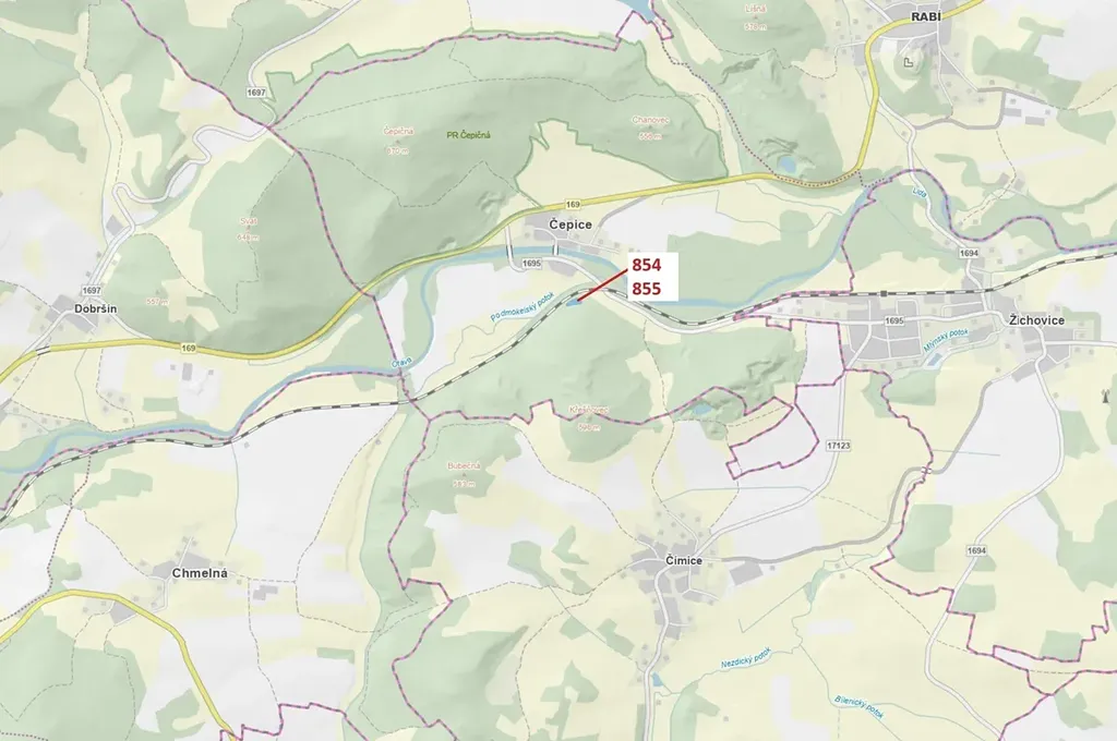 Lesní pozemky o výměře 2 561 m2, parcelní čísla 854, 855, podíl 1/1, katastrální území Čepice, obec Rabí, obec s rozšířenou působností Sušice, okres Klatovy, Plzeňský kraj. Po těžbě.