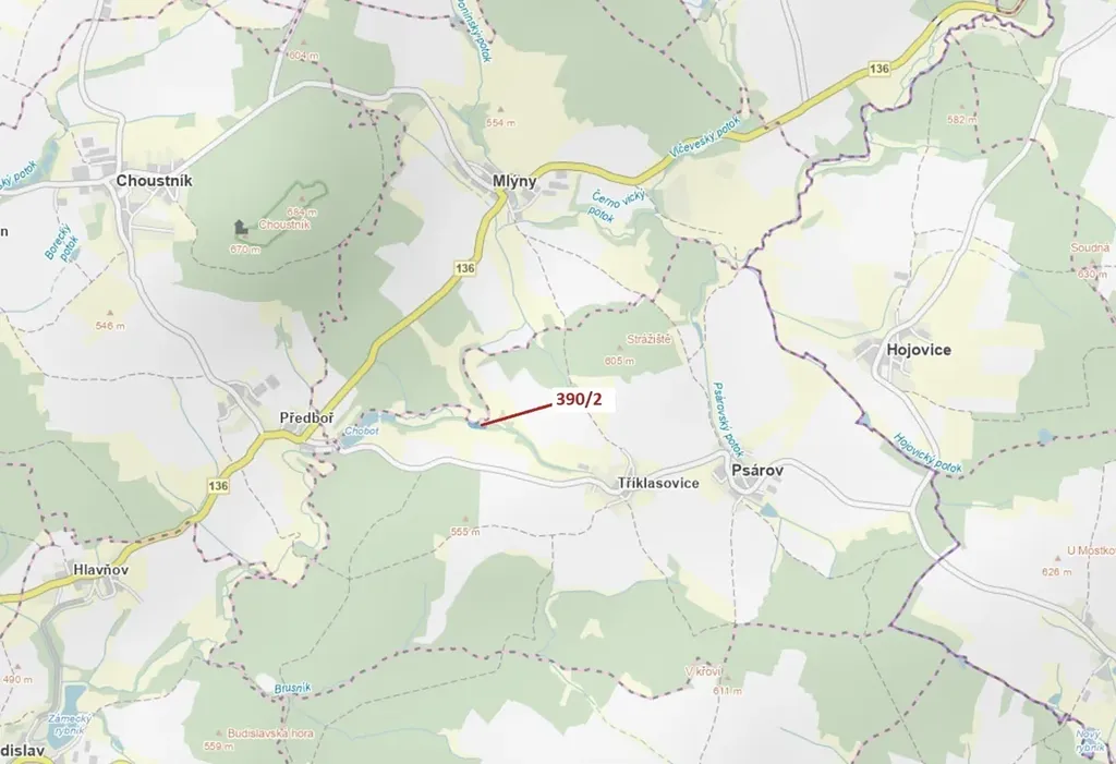 Lesní pozemek o výměře 3464 m2, parcelní číslo 390/2, podíl 1/1, katastrální území Tříklasovice, obec Psárov, obec s rozšířenou působností Tábor, okres Tábor, Jihočeský kraj. Po těžbě.