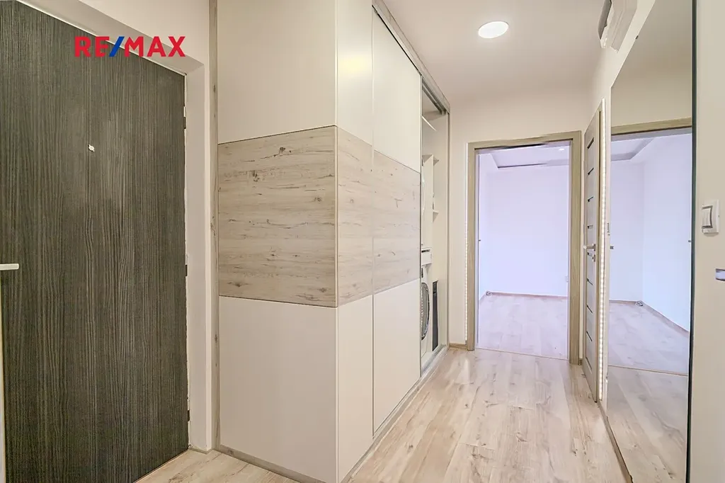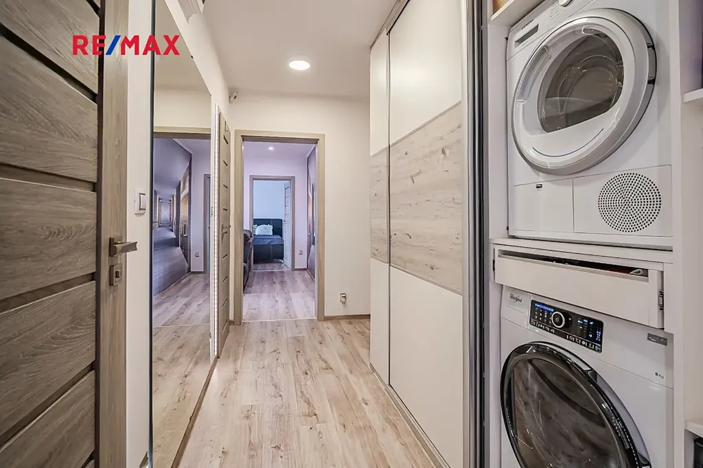 Byt po precizně provedené rekonstrukci a úpravě dispozice disponuje třemi samostatnými pokoji a kuchyní osazenou moderní kuchyňskou linkou na míru s vestavnými spotřebiči (plynový sporák, myčka, trouba a MV trouba), osazená kováním a pojezdy Blum a LED osvětlením a podsvícením. Prostorná vstupní chodba disponuje vestavnou skříní s hloubkou 76cm, s přípravou pro integrovanou pračku a myčku.