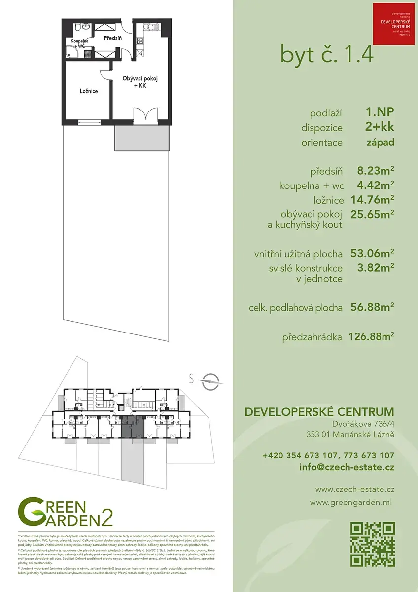 Nabízíme k prodeji moderní a nadstandardně řešený byt 2+kk o podlahové ploše 56,88 m² s prostornou předzahrádkou o velikosti 126,88 m², která je ve výlučném užívání bytu. Byt se nachází v 1. nadzemním podlaží novostavby Rezidence Green Garden 2 v centru Mariánských Lázní. Jedná se o byt v osobním vlastnictví, v domě je funkční SVJ a pro maximální komfort je zajištěno centrální vytápění i ohřev vody z vlastní plynové kotelny v domě.
