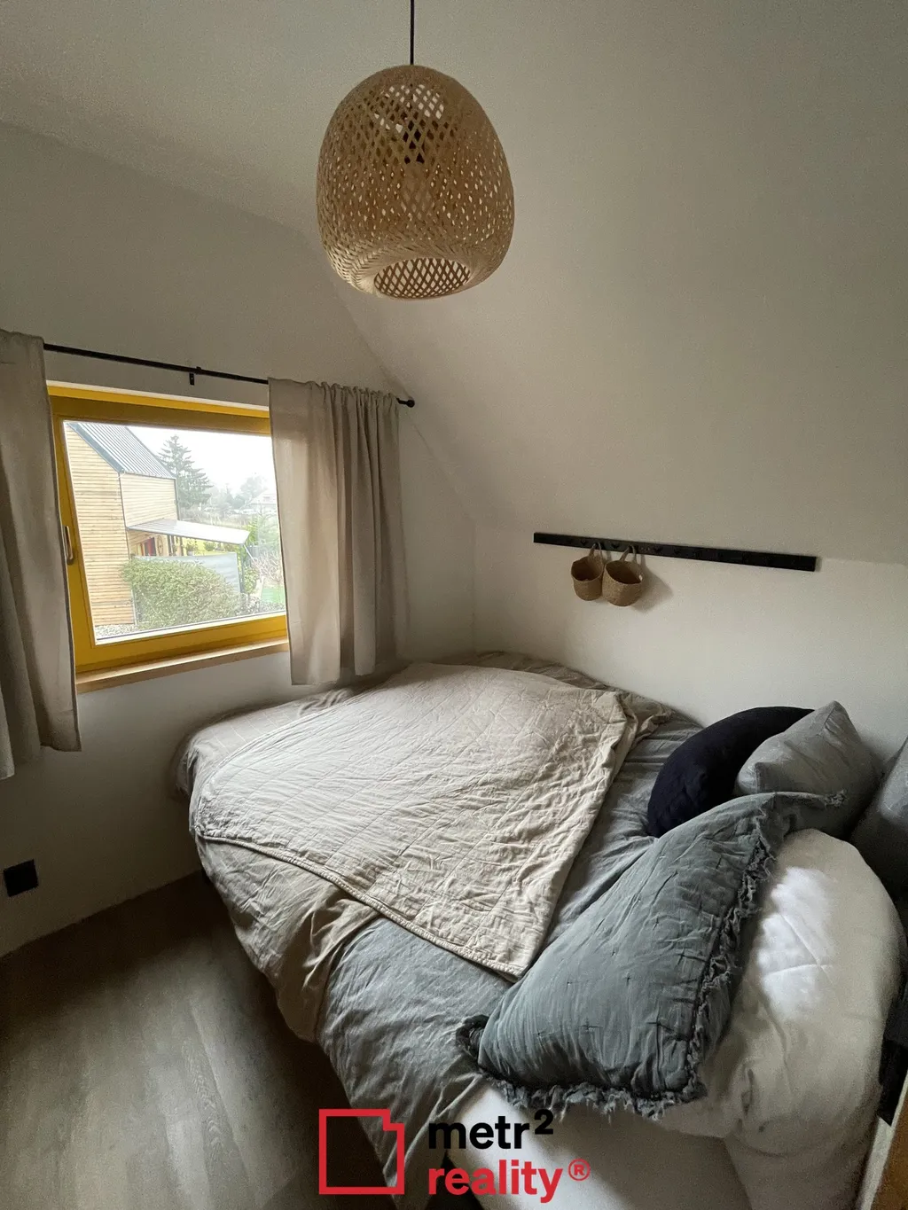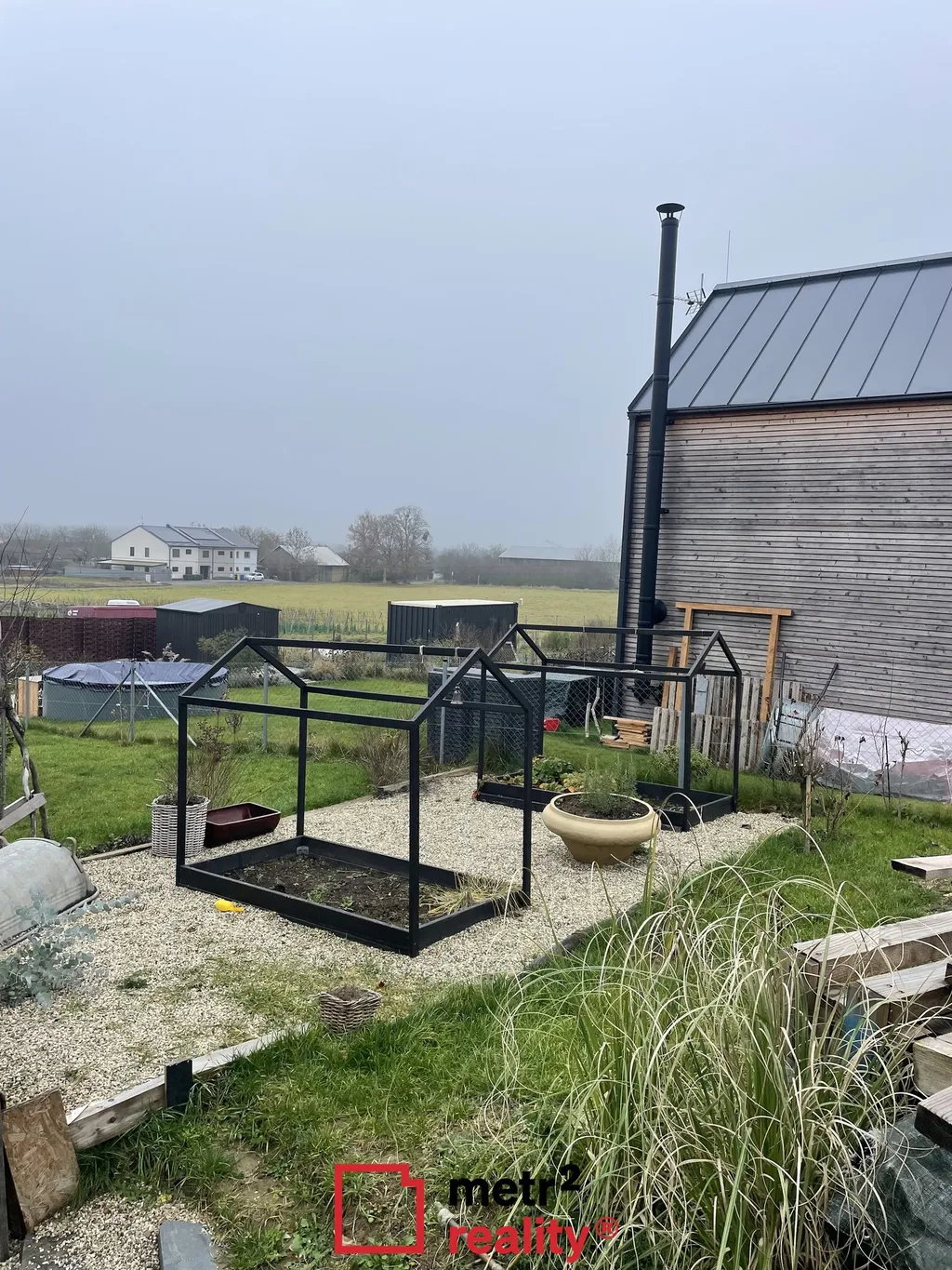 Dům o dispozici 3+1 je promyšleně řešen tak, aby každý člen rodiny našel svůj koutek. Dům je rozšířen přístavbou kontejneru. Moderní kuchyň v černém dekoru působí elegantně a nabízí plné vybavení, kde vaření bude radostí. Dětský pokoj je vybaven vestavěnou dvoupatrovou postelí, která šetří prostor a vnese do každodenního života dotek hravosti. Útulná ložnice přináší klidné zázemí pro chvíle odpočinku. Obývací pokoj s jídelní částí propojuje rodinu v jeden harmonický celek.