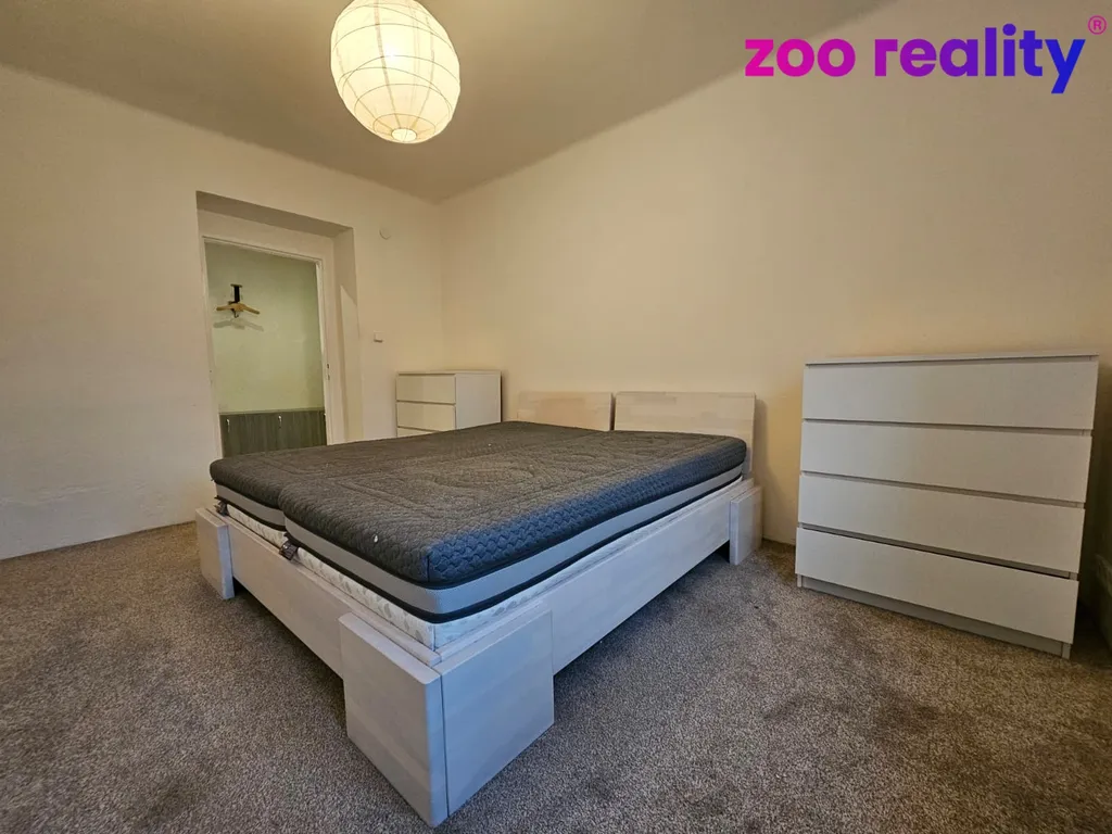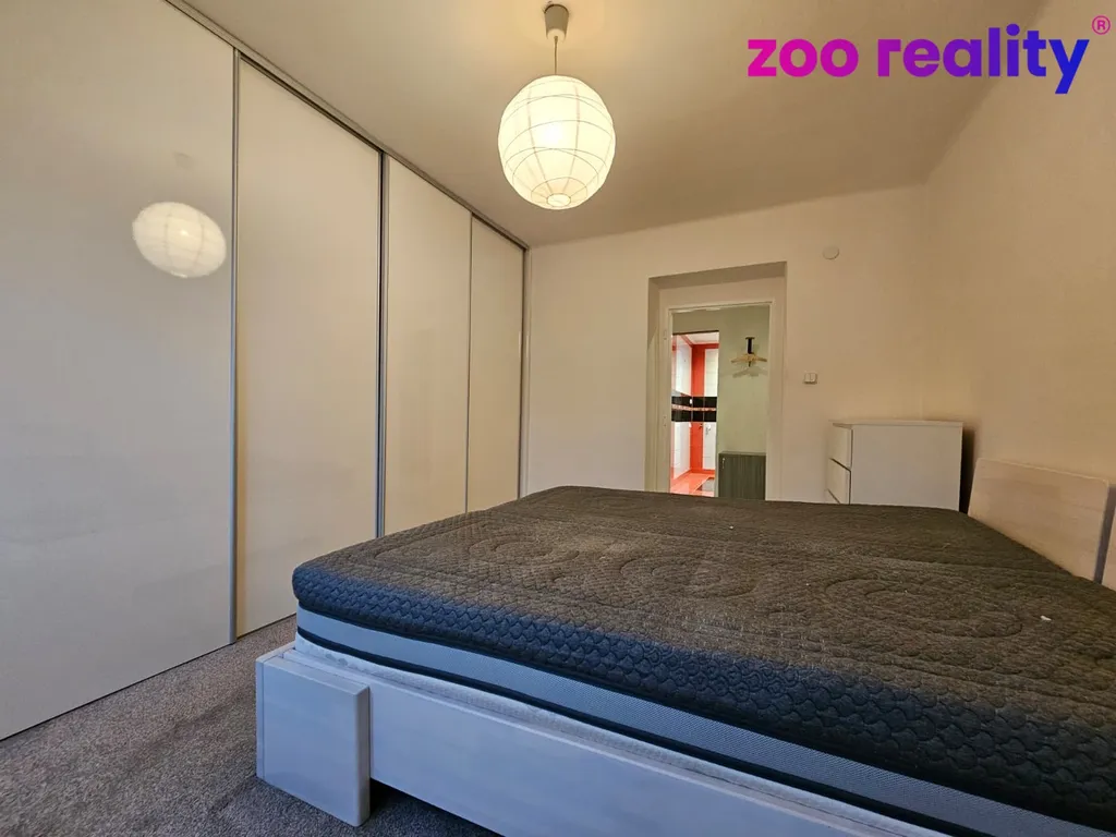 Obývací pokoj je zařízen sedačkou, konferenčním stolkem, televizní stěnou a televizí. Po celém bytě se nachází praktické skříňky a úložné prostory, které výrazně zvyšují komfort bydlení. Ložnice je vybavena vestavěnou skříní po celé délce stěny, komodami a manželskou postelí.