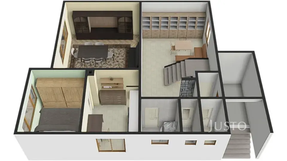 Nachází se zde kuchyně se spíží, prostorný obývací pokoj, ložnice, koupelna a samostatné WC. Dispozice je velmi funkční a nabízí pohodlné bydlení i pro vícečlennou rodinu.
