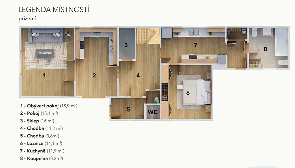 Dispozičně velmi dobře řešený dům poskytuje dostatek prostoru i soukromí pro vícečlennou rodinu. V přízemí se nachází obytná část s kuchyní, obývacím pokojem, ložnicí, koupelnou a technickým zázemím. V patře jsou další samostatné pokoje, koupelna a WC.