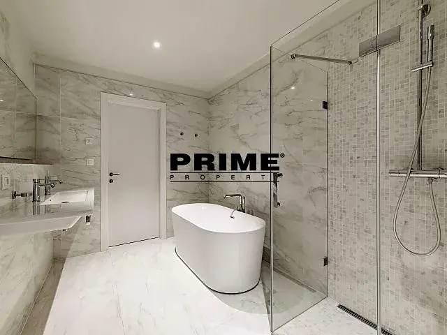 Dispozice bytu: prostorný obývací pokoj (78m2) s jídelní částí, vstupem na terasu (15m2) a s otevřenou, plně vybavenou italskou kuchyní se spotřebiči (indukční varná deska, elektrická trouba, lednice s mrazákem a myčka), hlavní velká ložnice (27m2) s vlastní koupelnou (vana, sprchový kout, umyvadlo, toaleta, bidet), další 2 ložnice (každá 17m2), druhá koupelna (vana, sprchový kout, umyvadlo, toaleta, bidet), prádelna a samostatné WC. Druhá terasa (8m2) je přístupná ze všech 3 ložnic. Dřevěné podlahy a velkoformátová dlažba. Klimatizace, rekuperace vzduchu, podlahové topení, pračka, sušička, internet přes optické vlákno, videotelefon, alarm. K dispozici je sklep 8m2.