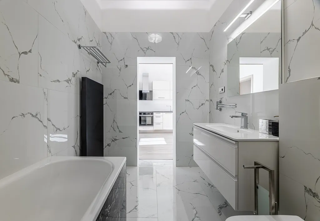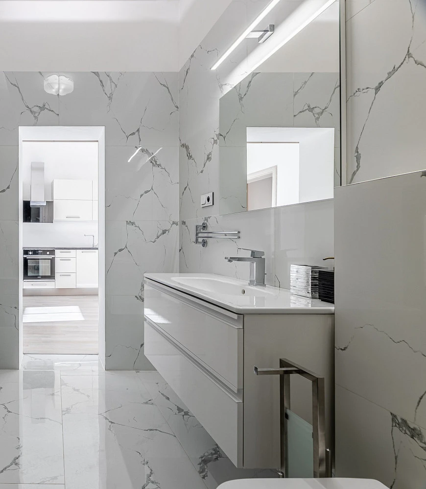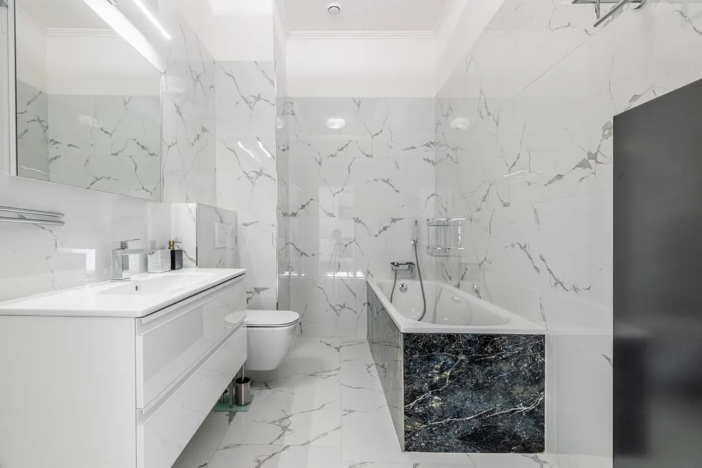 Z obývacího pokoje vstup do ložnice s výhledem na klidnou ulici, z prostorné chodby vstup do další ložnice (výhled do vnitrobloku). Designová koupelna s vanou a WC.