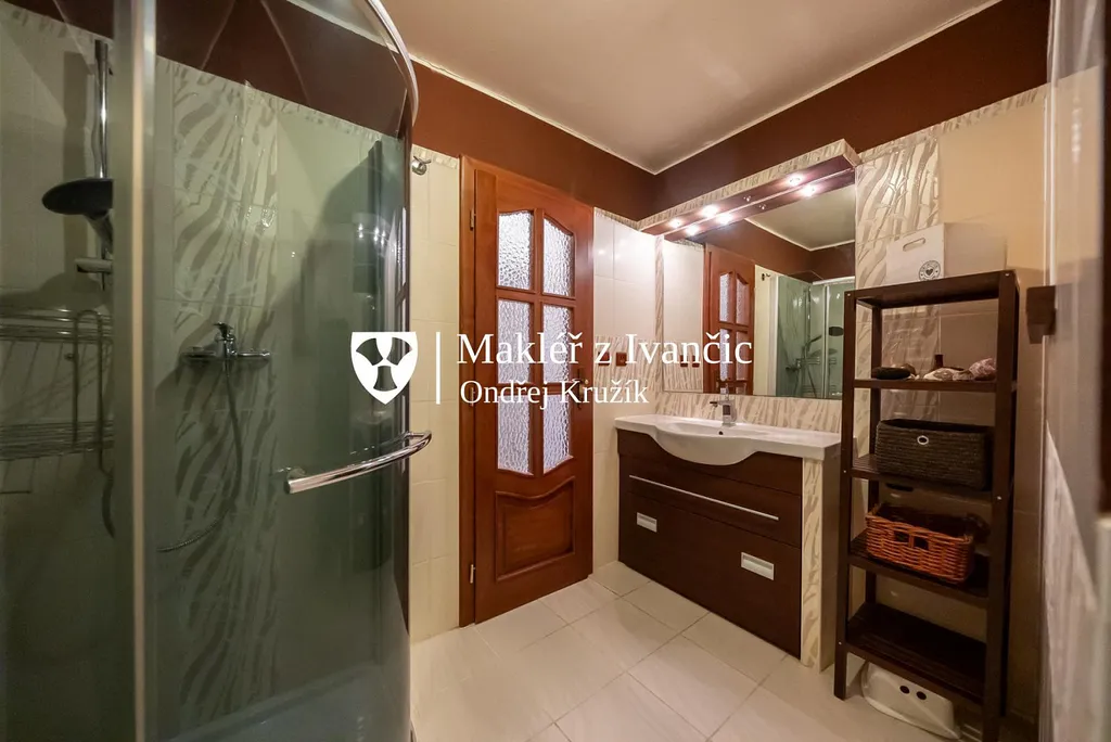 Samostatným vstupem se dostanete na schodiště do 1. patra, které tvoří částečně vybavená bytová jednotka 2+kk. Čeká zde zařízená kuchyně, krbová kamna, obývací pokoj s koženou sedačkou, jídelní kout, ložnice se vstupem na lodžii a první koupelna se sprchovým koutem a záchodem.