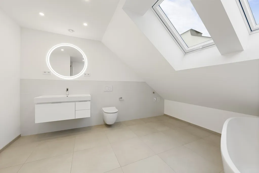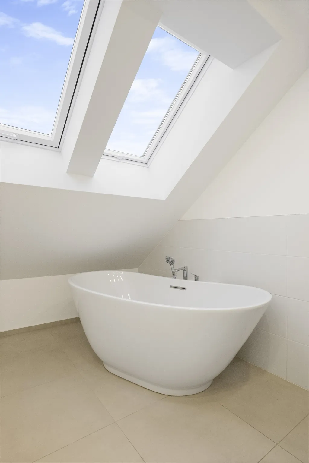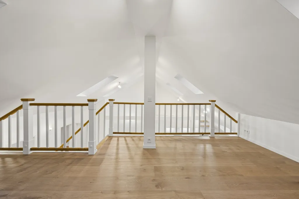 Dominantou bytu je prostorný a světlý obývací pokoj o velikosti cca 52 m² s vysokými stropy, který působí mimořádně vzdušně. Z obývacího pokoje vede elegantní dřevěné schodiště na otevřenou galerii, ideální pro pracovnu, knihovnu či odpočinkovou zónu. Dále se zde nachází kompletně vybavená kuchyňská linka včetně vestavných spotřebičů.
