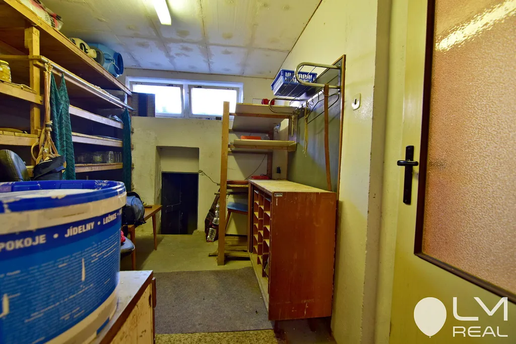 1. NP předsíň, zádveří, garáž, sklep, sklep na zeleninu, technická místnost, dílna s kamny na tuhá paliva, sklad na zeleninu, koupelna s vanou,
