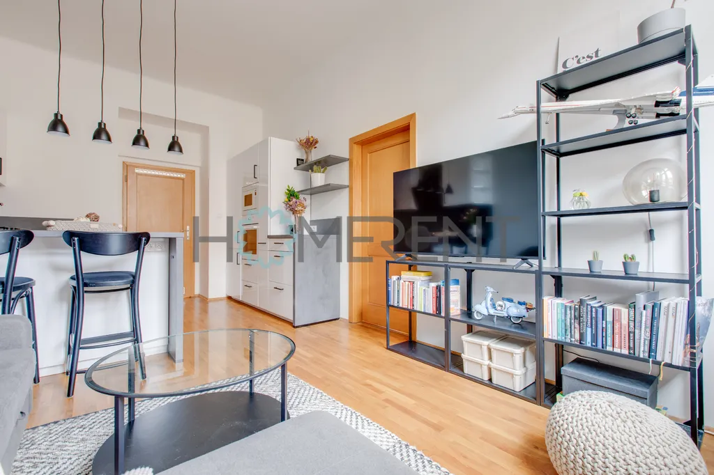 Byt zaujme nejen svým moderním provedením, ale také krásným výhledem na Žižkovskou věž, který dodává interiéru jedinečnou atmosféru. Díky vysokým stropům je byt velmi světlý a vzdušný.