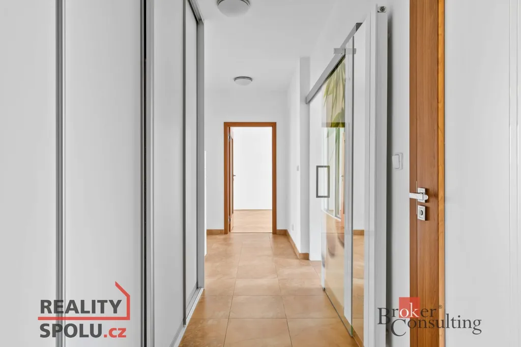 Dispoziční řešení bytu poskytuje velmi komfortní bydlení. Z chodby se vstupuje samostatnými vstupy postupně na samostatné WC, do koupelny se sprchovým koutek, do kuchyně s jídelním koutem, dále pak do ložnice a obývacího pokoje.