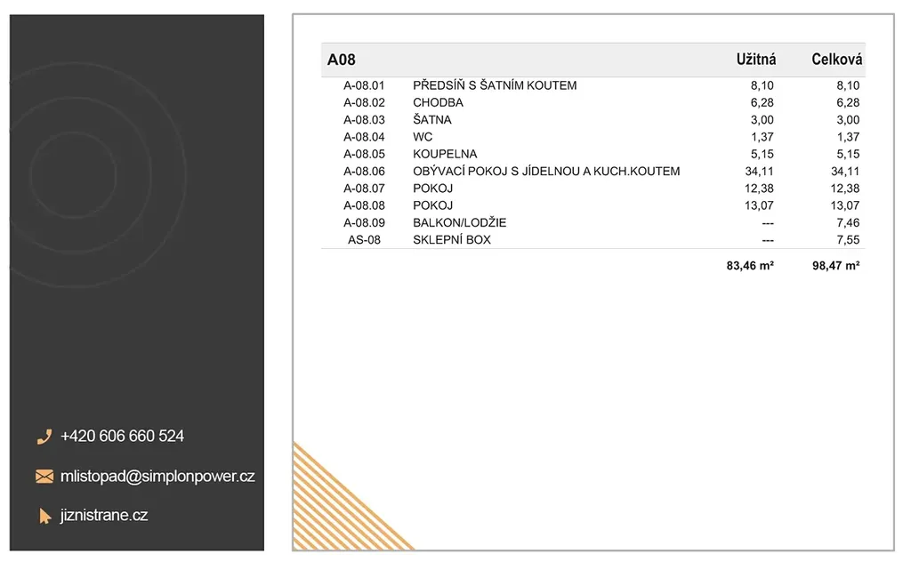Do této kategorie patří i prezentovaný byt s označením BD4_A08 o dispozici 3+kk s celkovou plochou 98,47 m² (byt 83,46 m², balkon 7,46 m² a sklep 7,55 m²).
