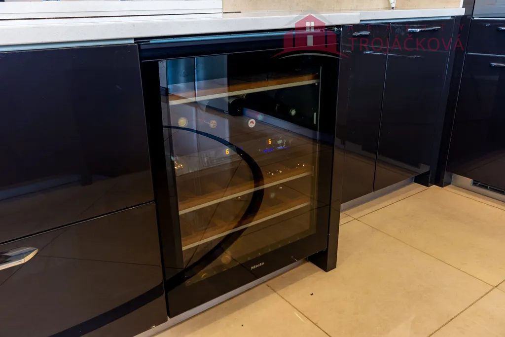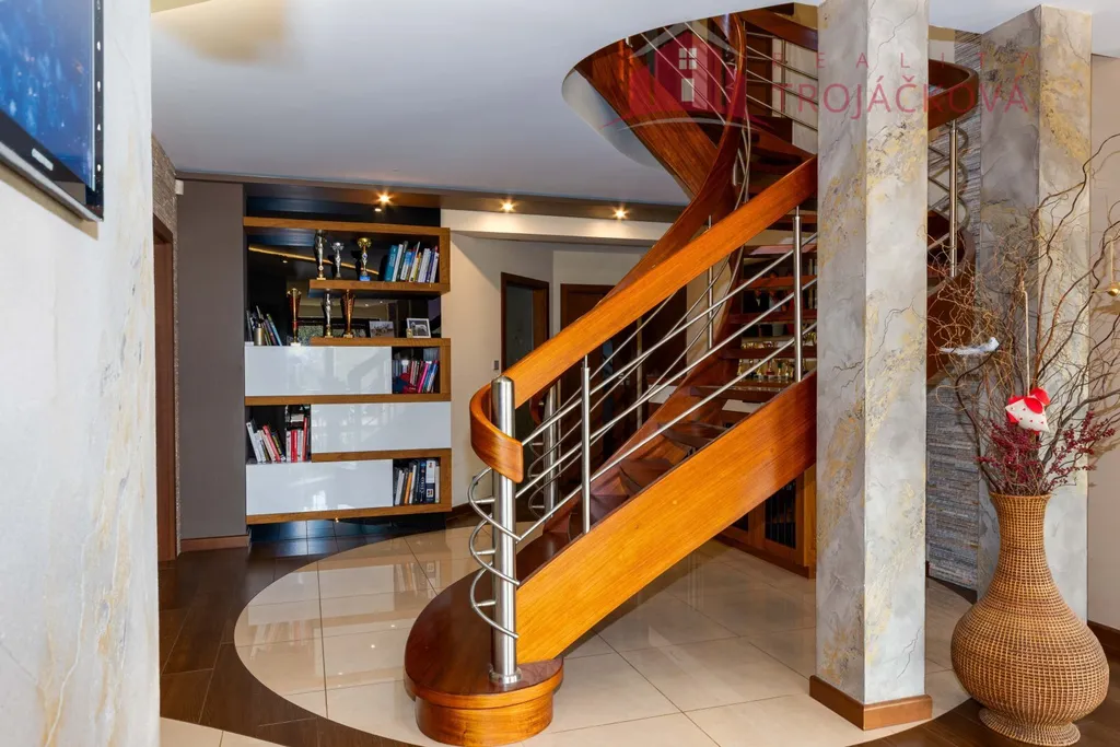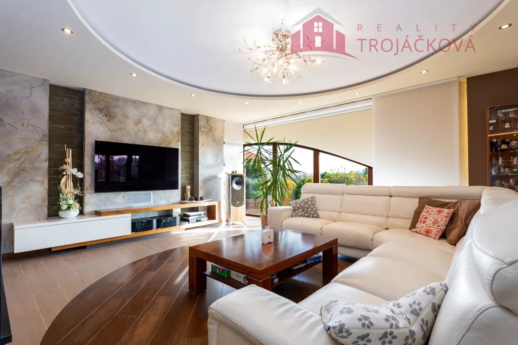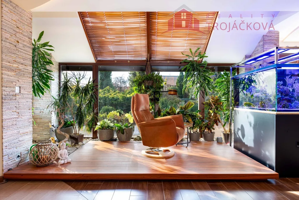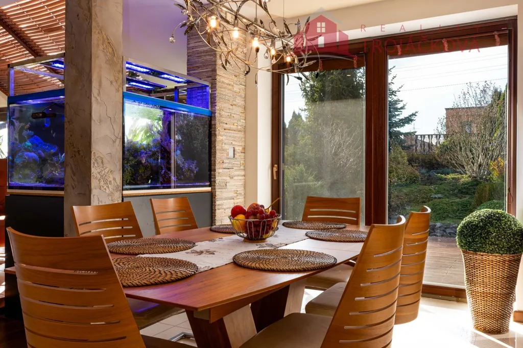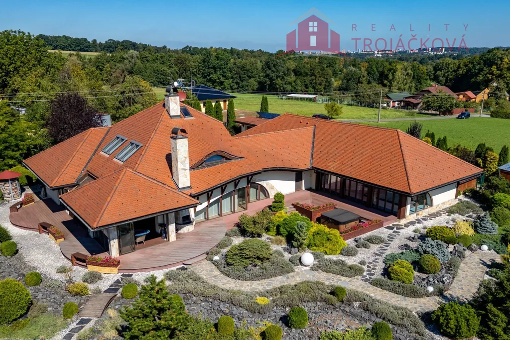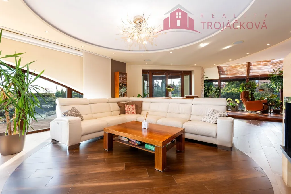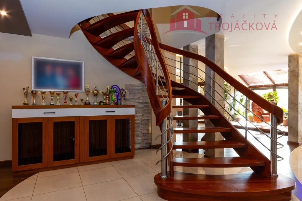 Přízemí se sestává z velkého obývacího pokoje propojeného s otevřenou jídelnou a kuchyní o ploše téměř 97 m2, kde se kombinuje moderní design s praktičností. Z obývací pokoje je vstup do zimní zahrady, je zde je krb a vestavěné mořské akvárium (800 l). Jídelna a obývací pokoj jsou vybaveny stropními designovými svítidly Swarovski. Na obývací pokoj navazuje moderní kuchyně vybavená kvalitními spotřebiči Miele, Liebherr a DeDietrich. Ze zádveří se vstupuje do technické místnosti a do haly a po obloukovém schodišti se z ní vychází do podkroví. Z haly je také vstup do pracovny, WC a ložnice. Na ložnici navazuje koupelna, která je průchozí a je z ní přístup do relaxační části objektu, kde se nachází vyhřívaný bazén s protiproudem (OXY systém) s vodní plochou 4x 8 m, finská sauna - vše s plně automatizovanou bazénovou technologií. Dále navazuje chodba s WC a sprchovým koutem. Z prostoru u bazénu je přímý vstup k vířivce a do zahrady. V podkroví se nacházejí tři pokoje, koupelna a WC. Součástí objektu je garáž se stáním pro 2 osobní automobily. Další dvougaráž je, jako samostatná stavba vedle domu spolu s hosp. budovou.