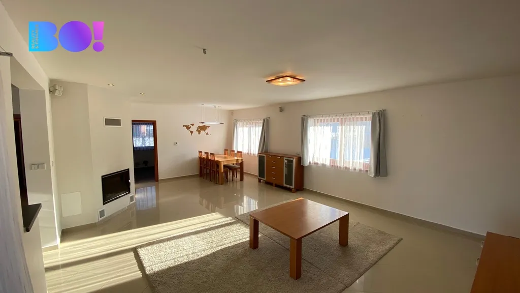 Dům o dispozici 3+kk o celkové ploše 144 m² se nachází na rovinatém, celodenně prosluněném pozemku o výměře 1 299 m². Součástí pronájmu je samostatná dvojgaráž o velikosti 53 m².