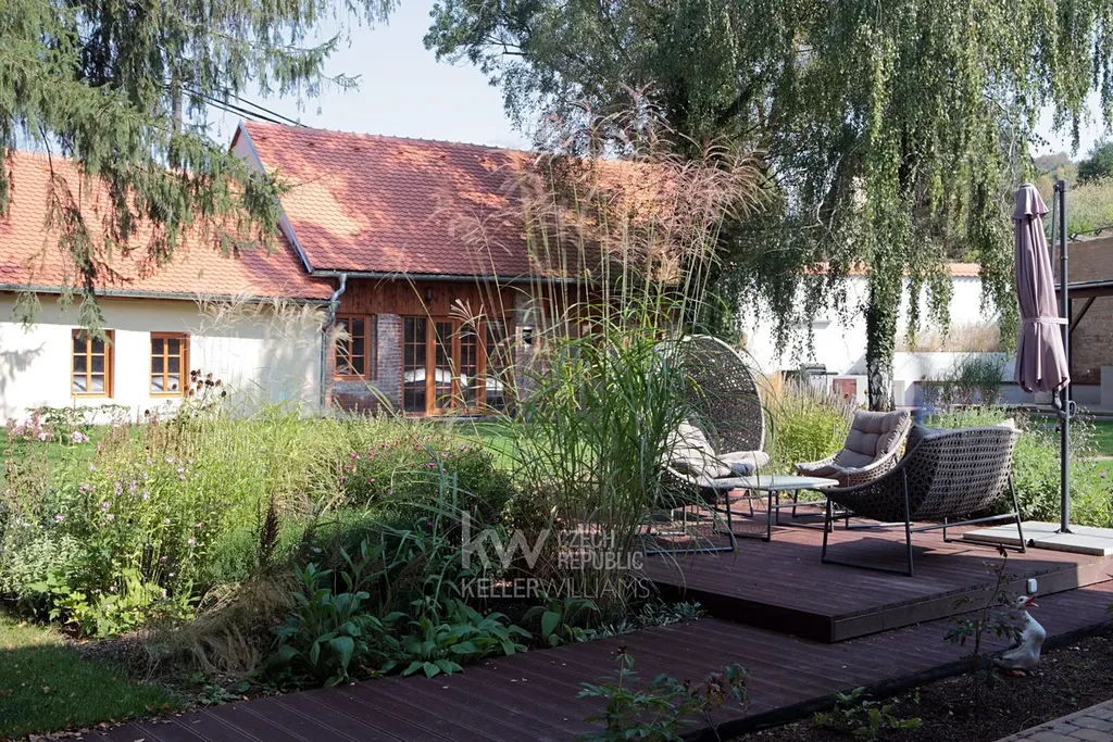 Stejně pečlivě jako interiér byla navržena i celá zahrada. Působí zcela přirozeně a volně navazuje na charakter okolní krajiny. Součástí zahrady je venkovní kuchyně, posezení s ohništěm, terasy i bazén umístěný na slunné části pozemku. Uzavřený dvůr poskytuje maximální soukromí a vytváří atmosféru klidného venkovského sídla, které působí elegantně, útulně a nadčasově.