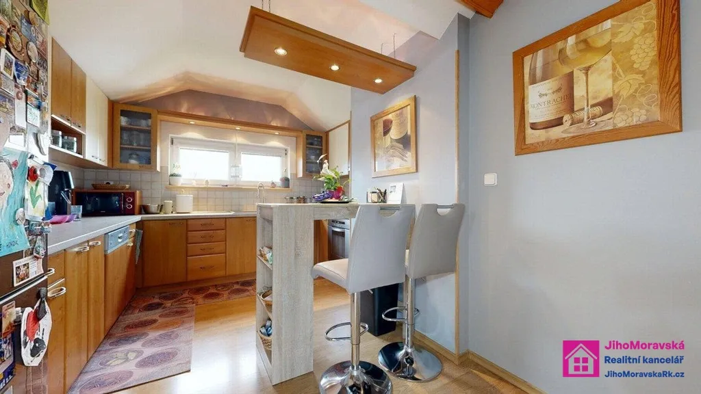 V kuchyňské lince jsou zabudovány vestavěné spotřebiče (digestoř, plynová varná deska, elektrická trouba, myčka) plus samostatně stojící lednice s mrazničkou). Podlaha je pokrytá dlažbou a vinylem. Byt je vytápěn plynovým kotlem, který je zavěšen v malé technické místnosti u schodiště před vstupem do bytu.