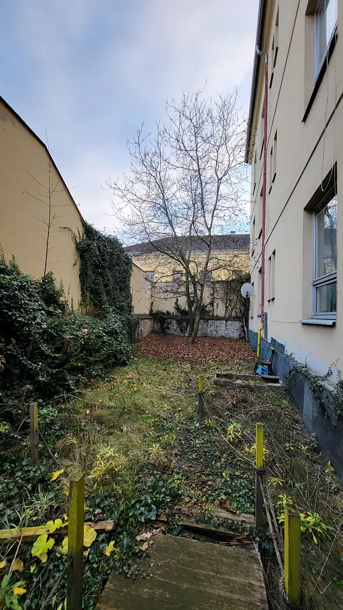 Zahrádka. Dům není chráněnoou památkou a je nyní připojen na elektřinu i funkční dálkové vytápění (teplárnou).