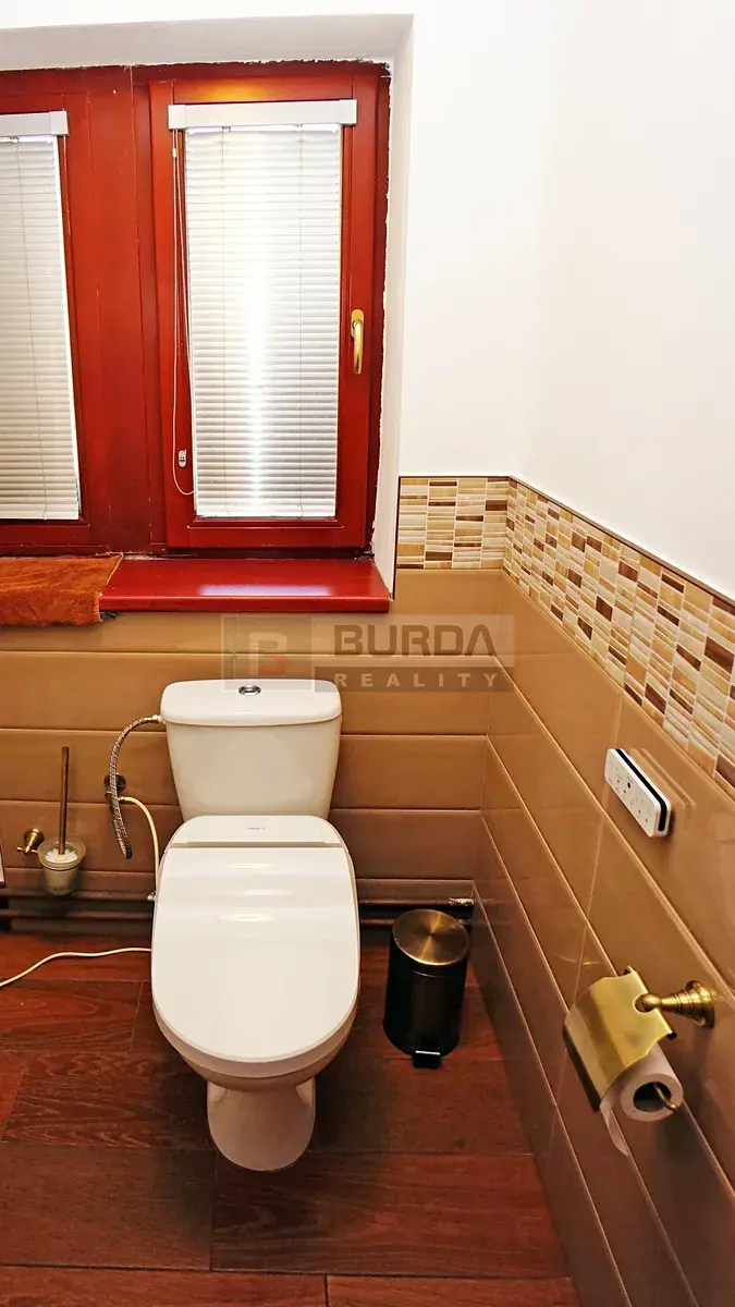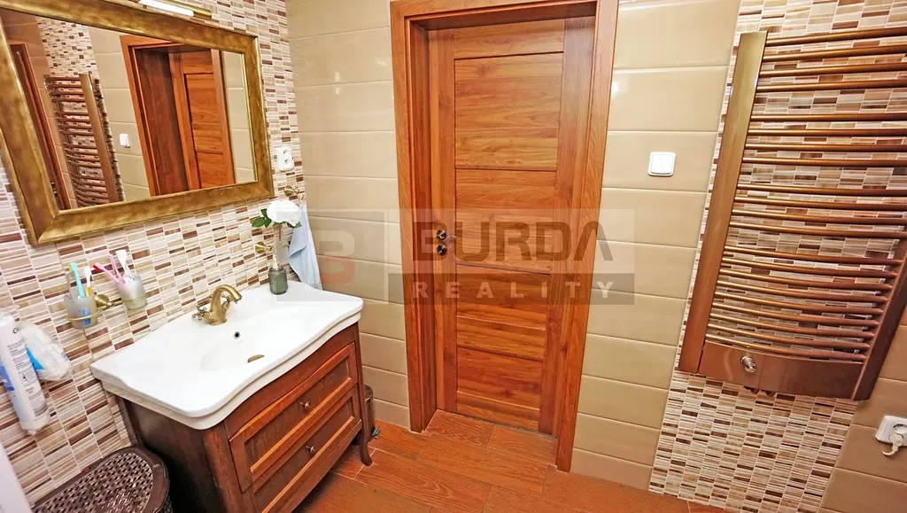Zařizovací předměty v koupelně jsou ze Sapho koupelny, série Antea, sprchový kout 90 x 90 cm se spec. sklem, baterie Antic, umyvadlo s masivní skříňkou, topný žebřík, samostatné WC s bidetovým sedátkem USPA s dálkovým ovladačem (lze zanechat). Přípojky pro pračku a sušičku (vedle přípojek je příprava pro vanu – odpad a voda). Pračka ani sušička nezůstane.