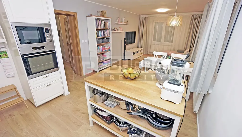 V bytě byla osazena nová kuch. linka Ikea s vestavěnými spotřebiči Mora: sklokeramická varná deska, digestoř, el. trouba a mikrovlnná trouba. Lednice s mrazákem je nová zn. Candy.