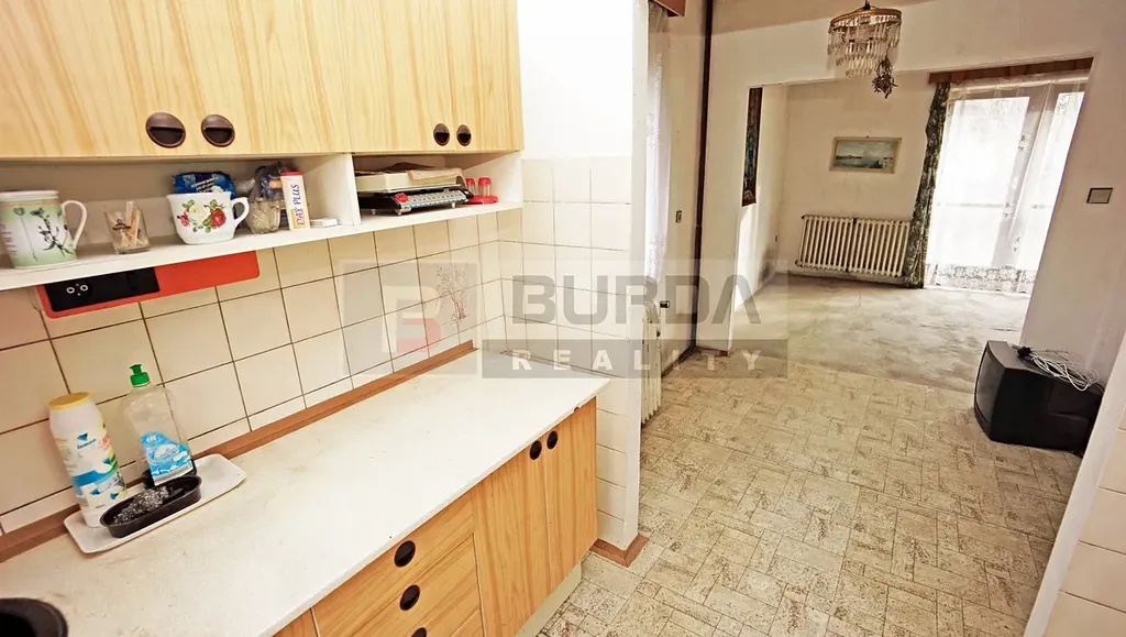 V kuchyni je původní kuchyňská linka bez sporáku a nerezová digestoř.
