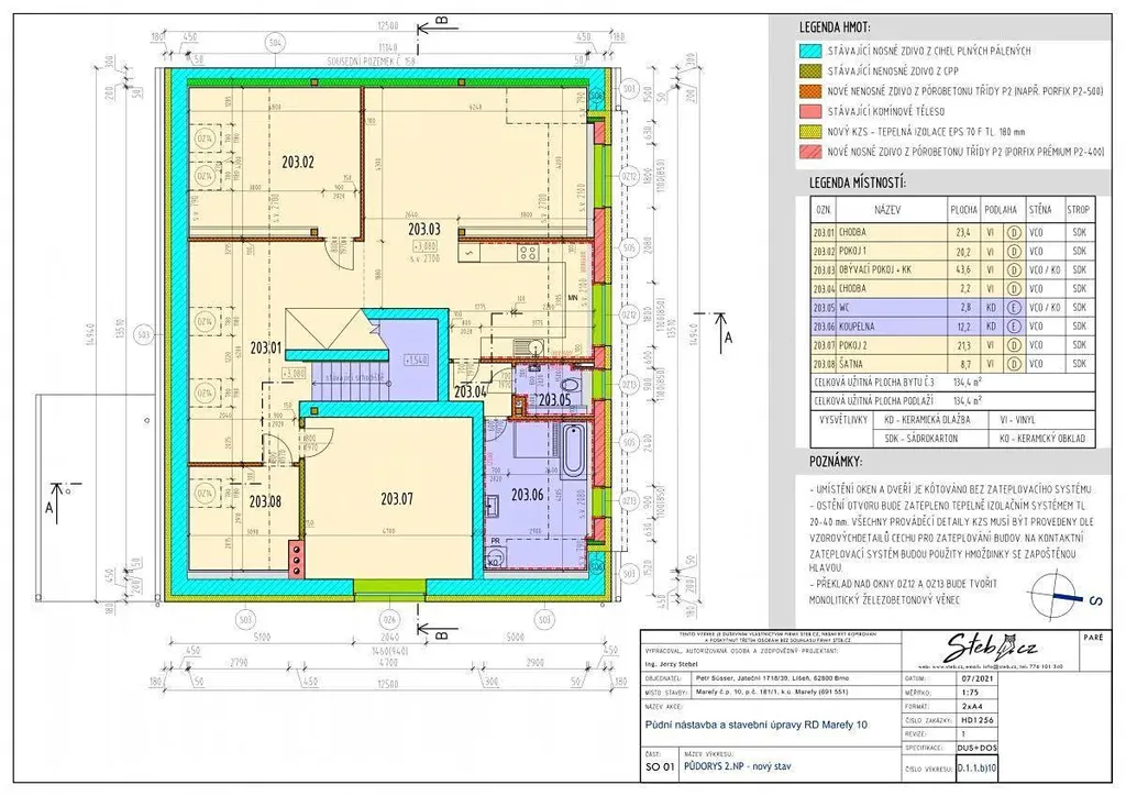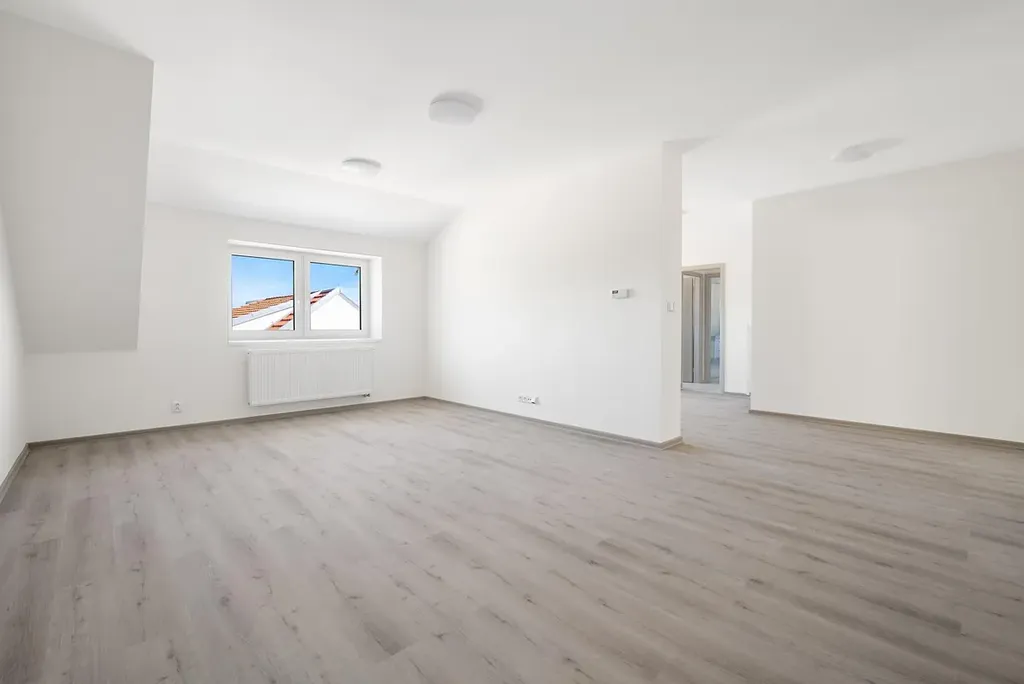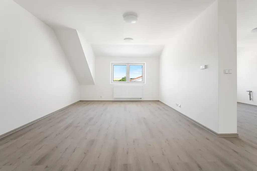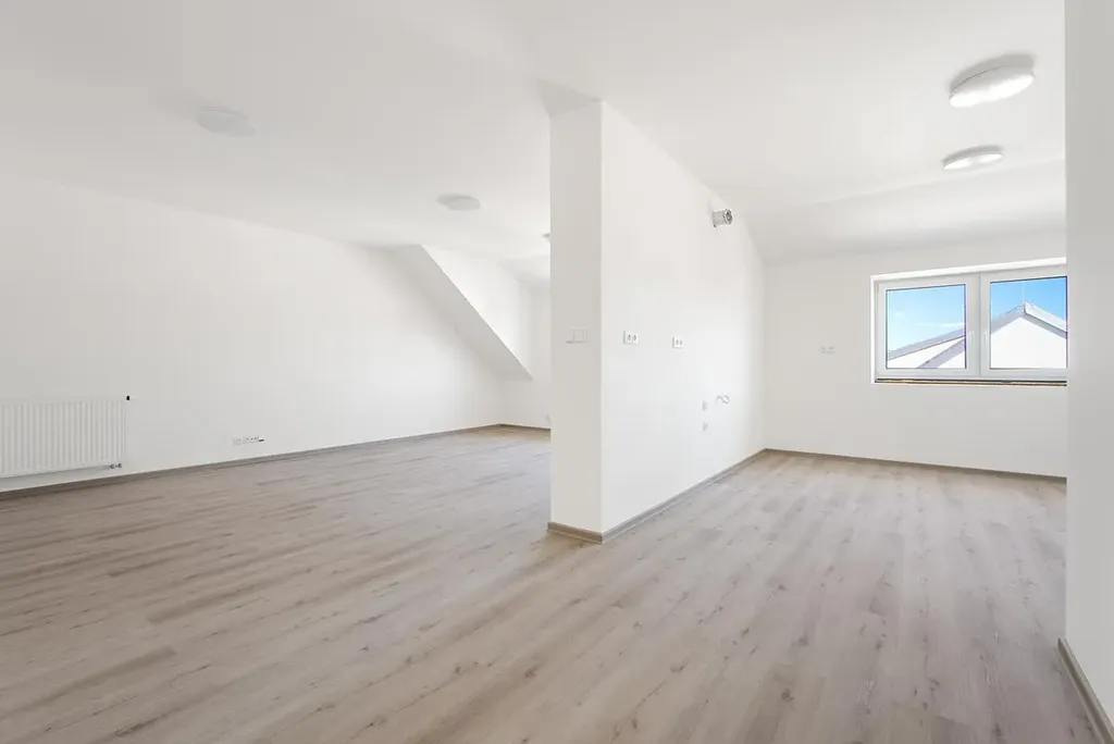 byt s dispozicí 4+kk (206 m2) s garáží (44 m2) a parkovacím stáním (12 m2) se nachází ve 2. nadzemním podlaží (podkroví) rodinného domu.