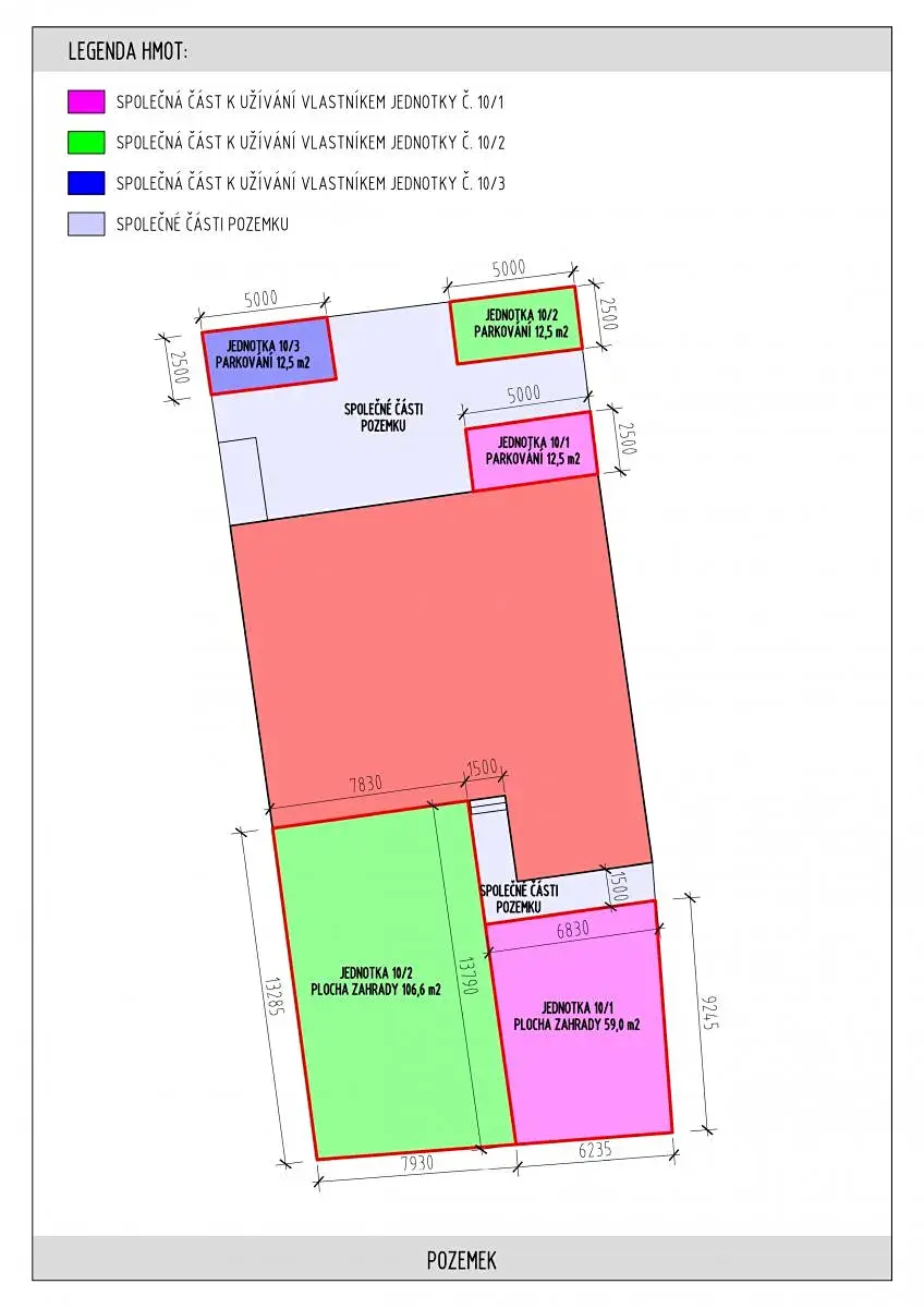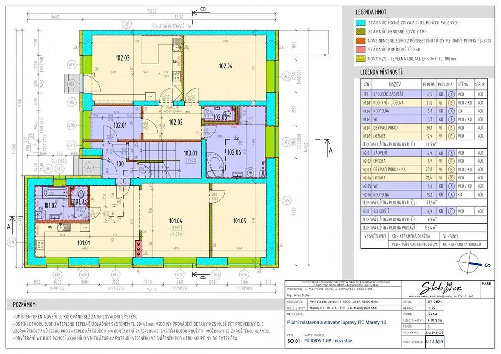 byt s dispozicí 3+kk (104 m2) k němuž náleží parkovací stání (12 m2), zahrada (59 m2) a sklep (34 m2) se nachází v 1. nadzemním podlaží