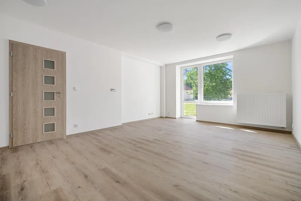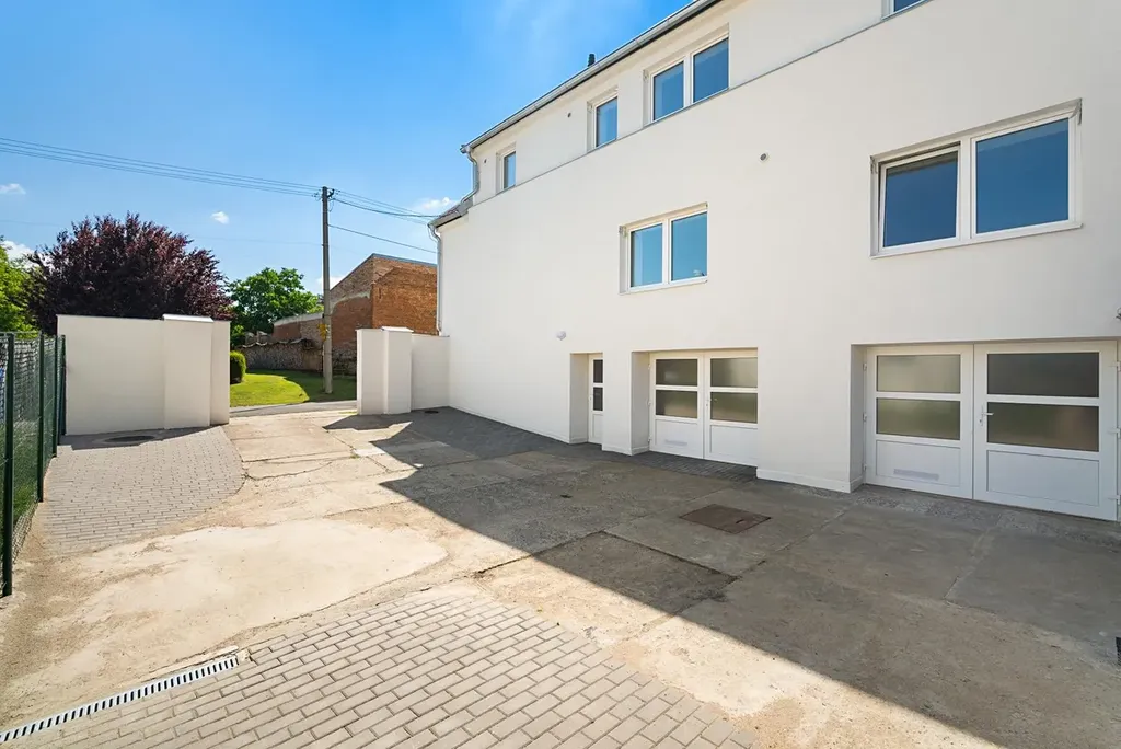 byt s dispozicí 2+kk (101 m2) s garáží (20m2), parkovacím stáním (12 m2) a zahradou (107 m2) se rovněž nachází v 1. nadzemním podlaží
