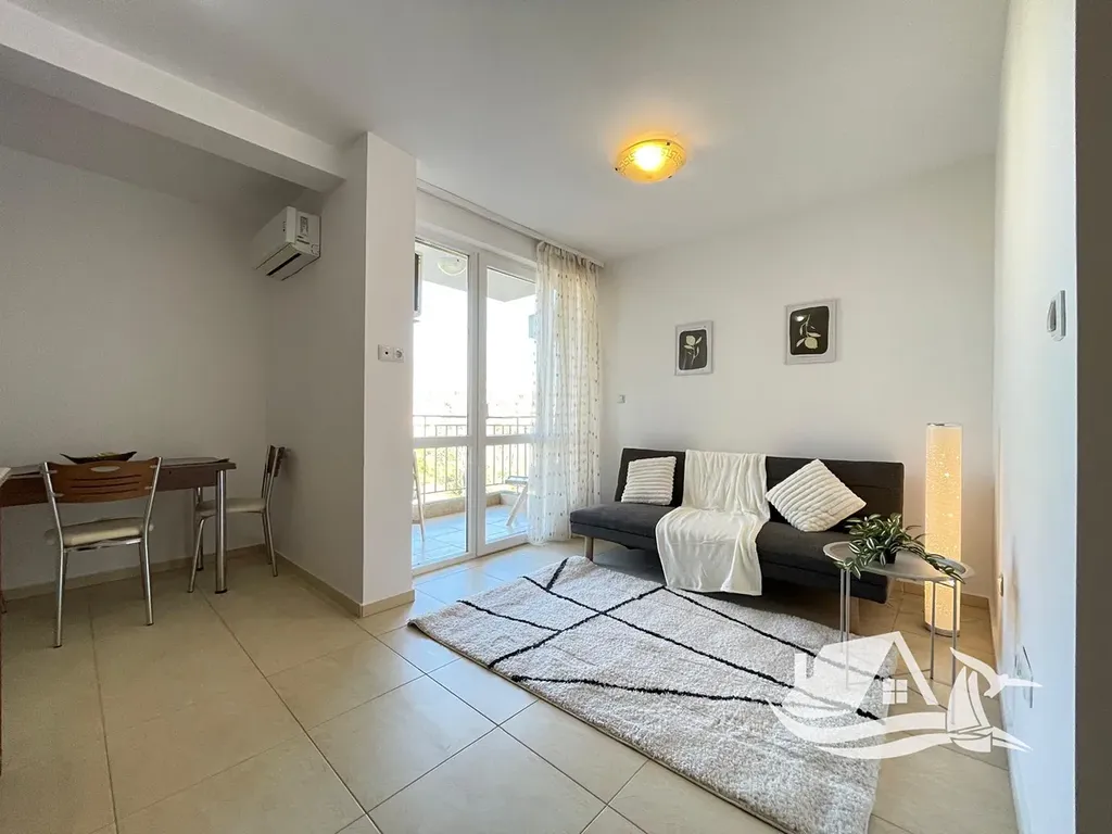Dispozice zahrnuje vstupní chodbu, moderně zrekonstruovanou koupelnu se sprchovým koutem, obytný prostor propojený s kuchyňským koutem, jídelní část a posezení. Z obývací části je vstup na malý, útulný balkon s výhledem na bazén a okolí resortu. Právě balkon dodává bytu příjemný venkovní prvek a prostor pro ranní kávu nebo večerní odpočinek.