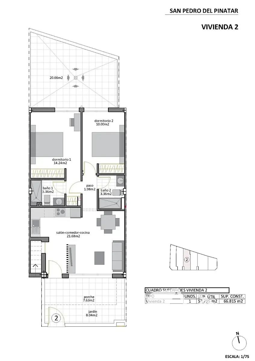 V San Pedro del Pinatar, vyhledávaném přímořském městečku na pobřeží Costa Cálida, vzniká komorní projekt stylových bungalovů jen 600 metrů od moře. Nabízený byt 3+kk má 66 m² a nachází se v přízemí, ideální pro ty, kteří milují komfort, soukromí a přímý kontakt s venkovním prostorem.