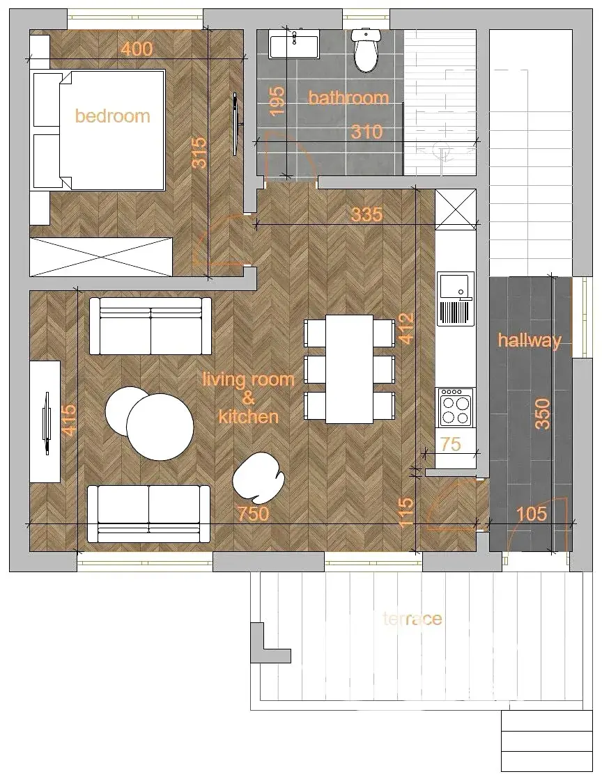 Dům má dvě podlaží a celkovou obytnou plochu 140 m². Přízemí tvoří kuchyně spojená s jídelnou a obývacím pokojem, samostatné WC a prostorná terasa s výhledem do zeleně. V horním patře se nachází koupelna, chodba, tři ložnice a balkon.