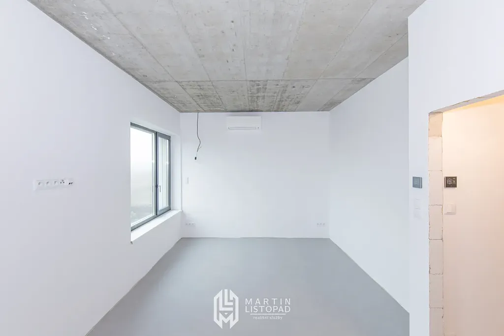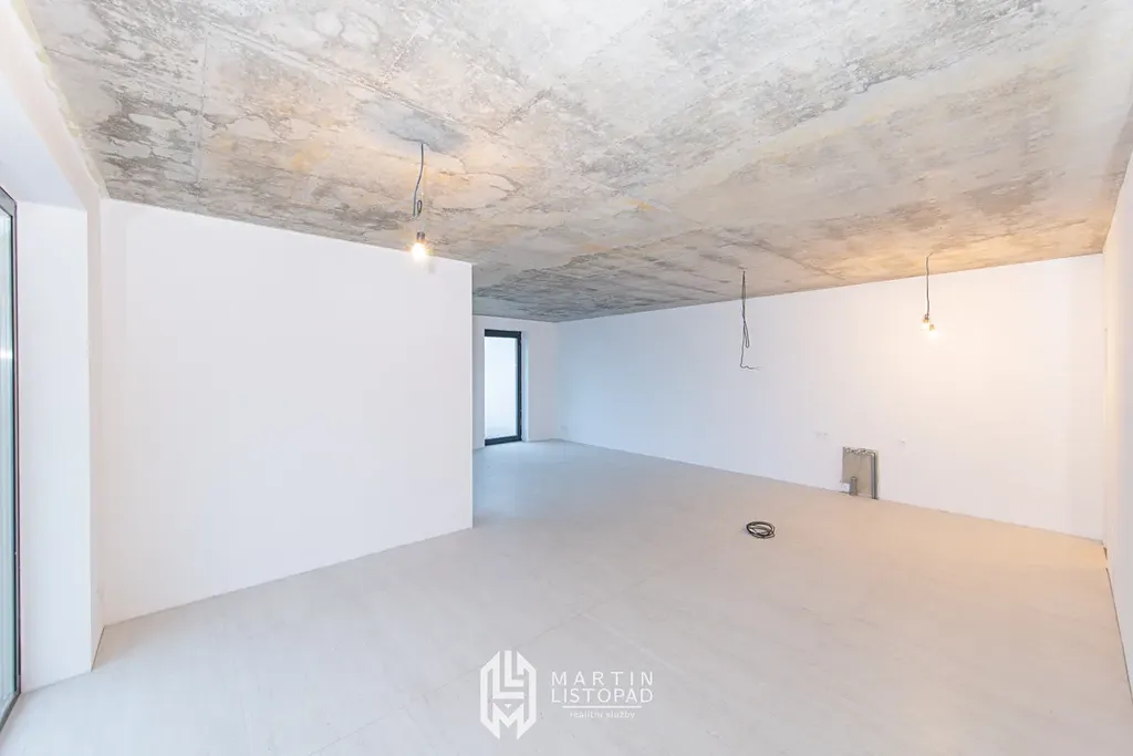 Vizuální dominantou interiéru jsou přiznané betonové stropy, které elegantně kontrastují s designovou velkoformátovou dlažbou. Ta je použita nejen v koupelnách, ale také v obývacím prostoru propojeném s kuchyňským koutem a na chodbách. V některých obytných místnostech je položena kvalitní vinylová podlaha.