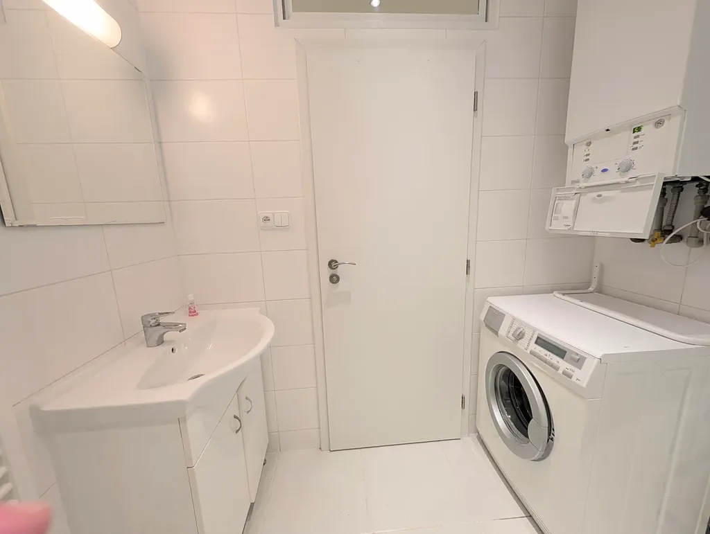Koupelna je vybavená sprchovým koutem, WC a pračkou, topení a ohřev teplé vody je řešené kombinovaným plynovým kotlem Junkers.
