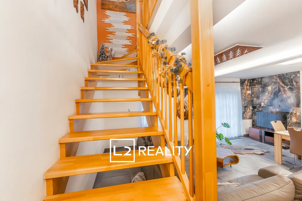 Interiér domu působí moderně a nadčasově, byly instalovány nové SDK podhledy se zabudovaným LED osvětlením, velkoformátová dlažba v přízemí s podlahovým vytápěním v obývacím pokoji vytvářejí velmi komfortní atmosféru. Součástí rekonstrukce byla výměna veškerých podlahových krytin v obytných místnostech za dřevěnou plovoucí podlahu a osazení nového plynového kotle Bosch s modulačním hořákem, který má potenciál výrazně snížit stávající provozní náklady na vytápění a ohřev TUV.